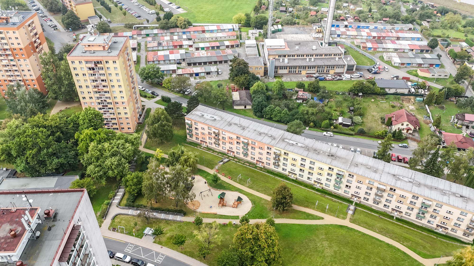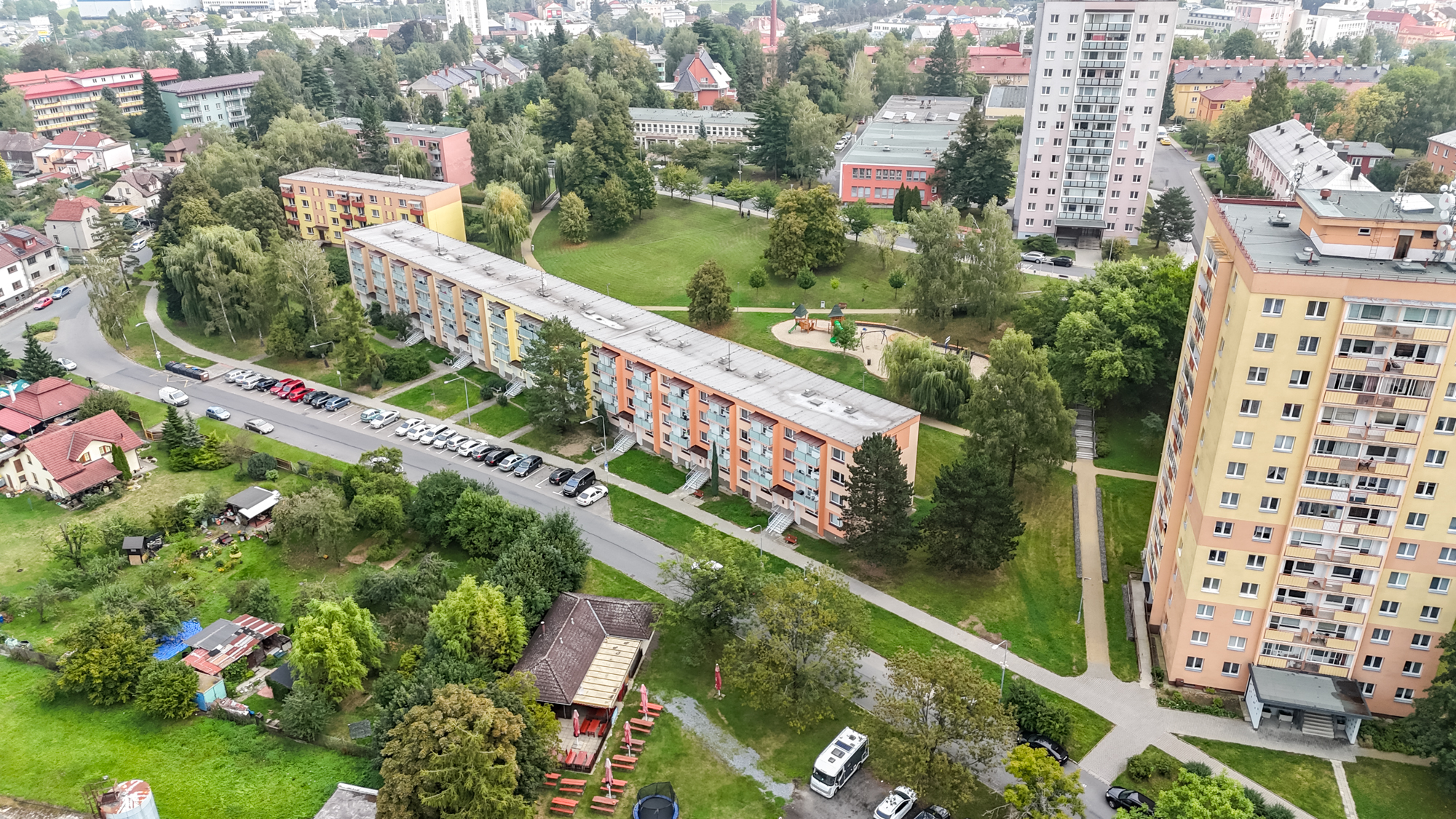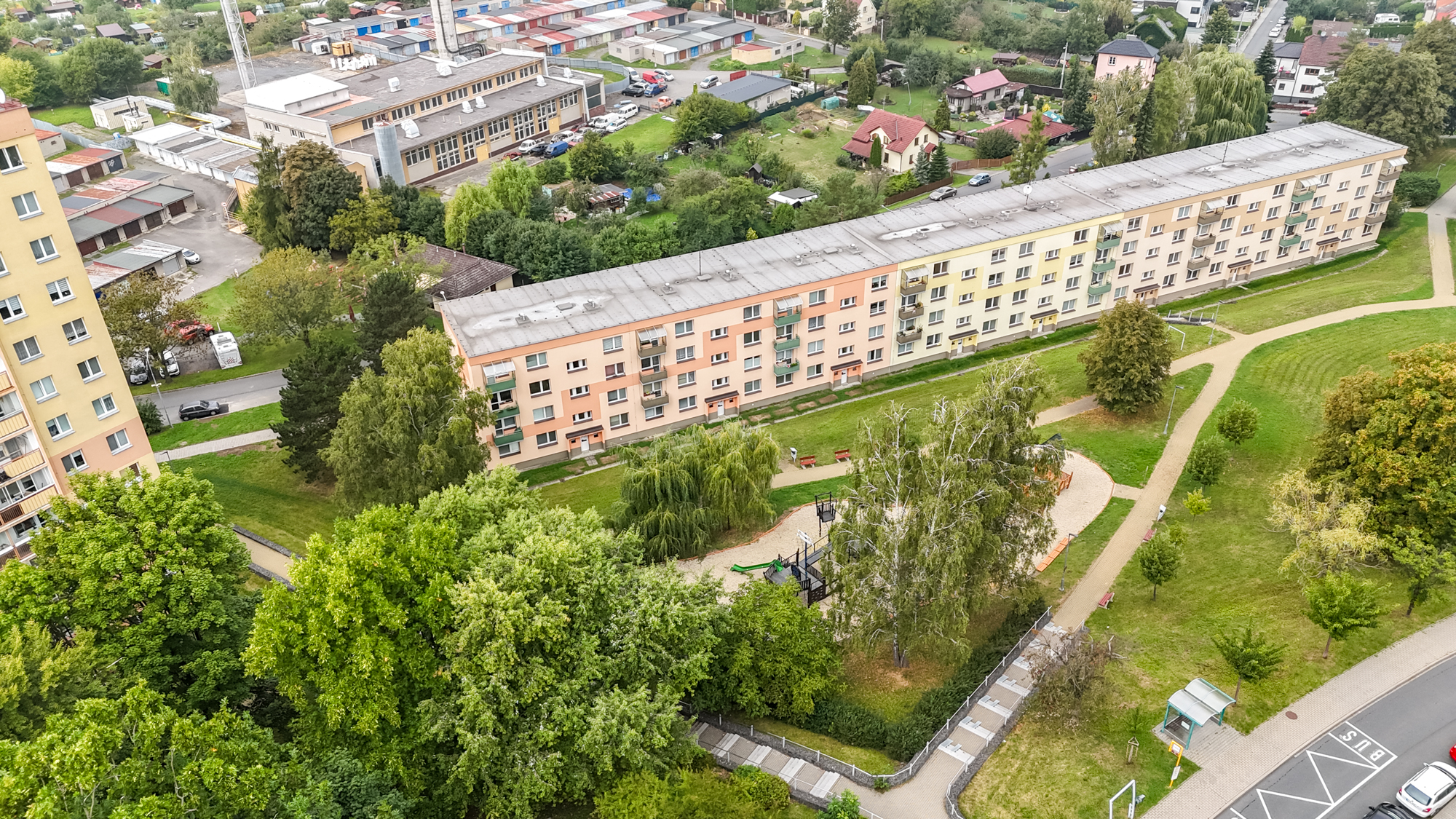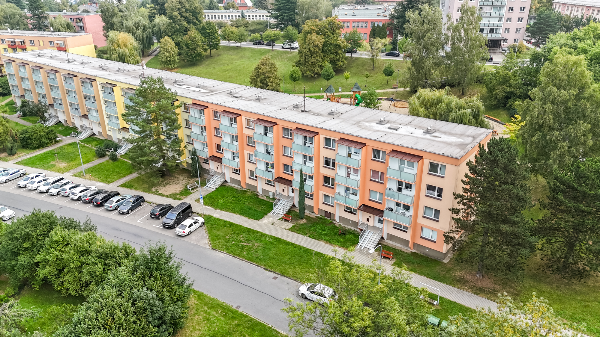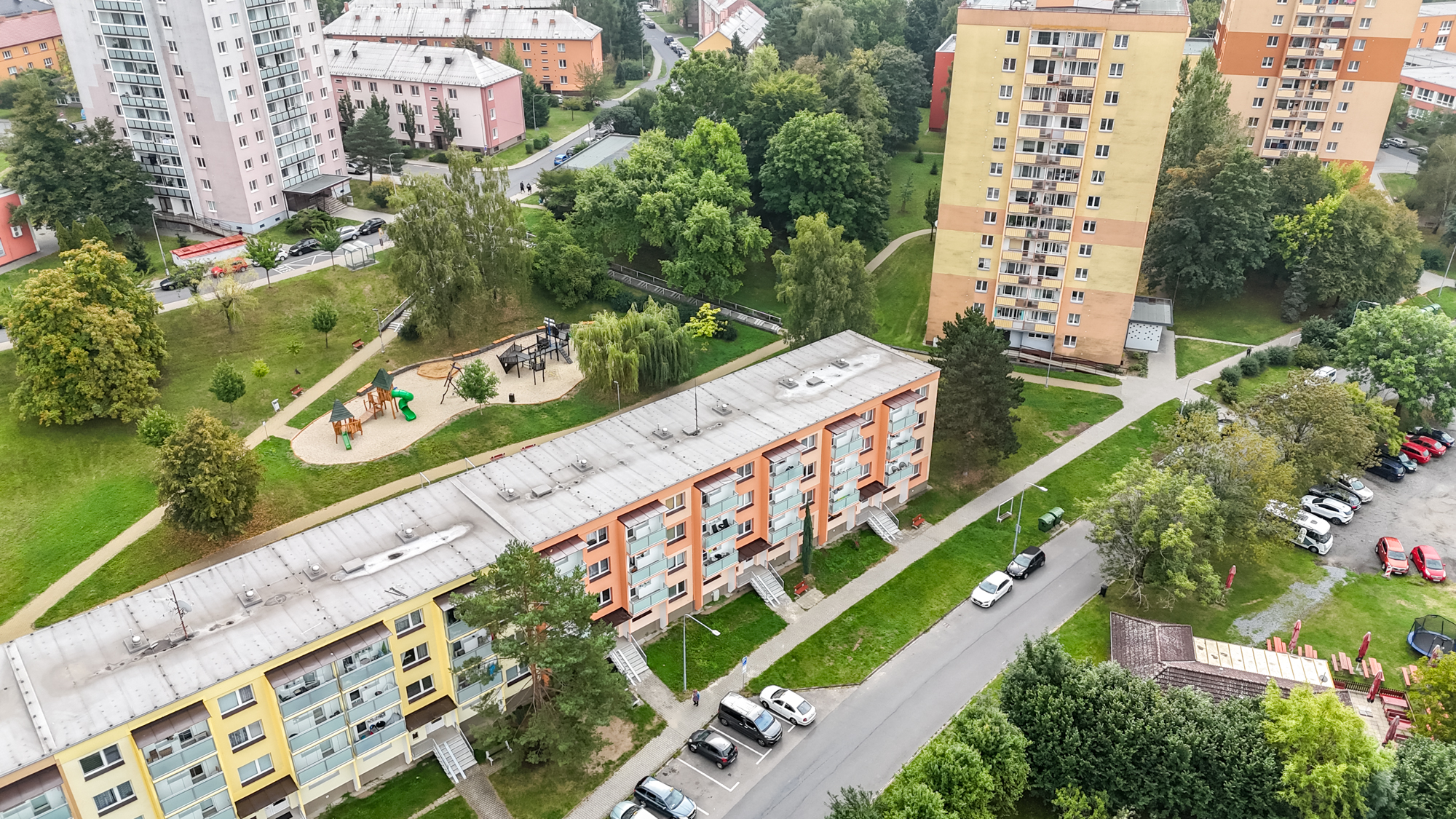 Okolí domu si rychle oblíbíte. Parkování je hned před domem, za ním zrekonstruované dětské hřiště a do obchodu, školy nebo k lékaři dojít zvládnete pěšky. A pokud vyrážíte dál, na dálnici jste autem za pár minut. Všechno, co potřebujete pro pohodlný život, je tady po ruce.