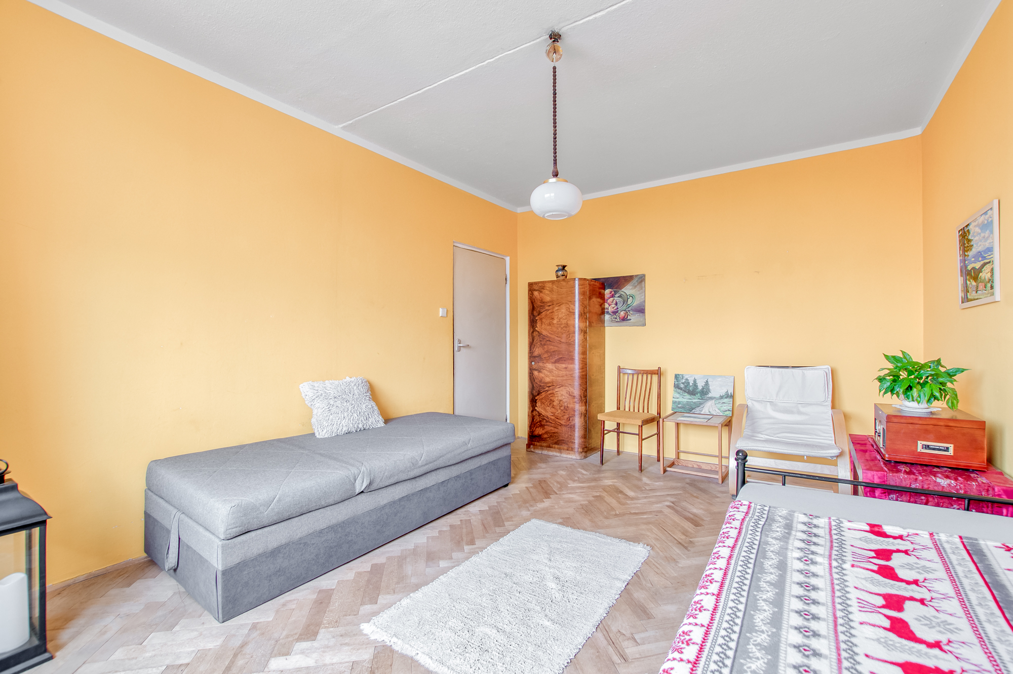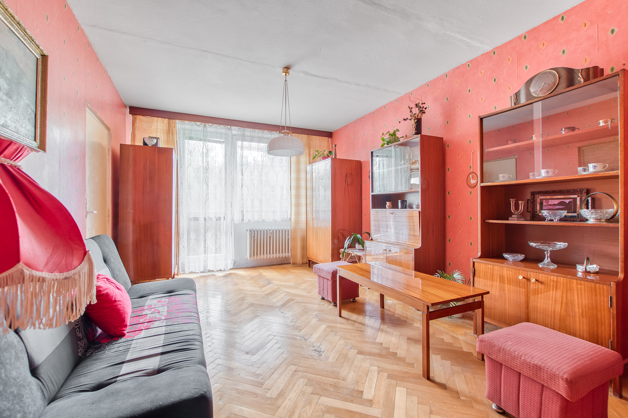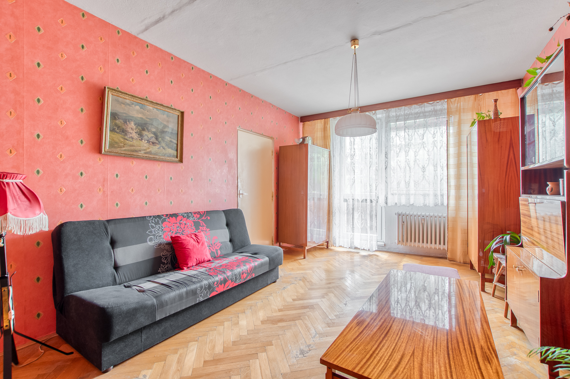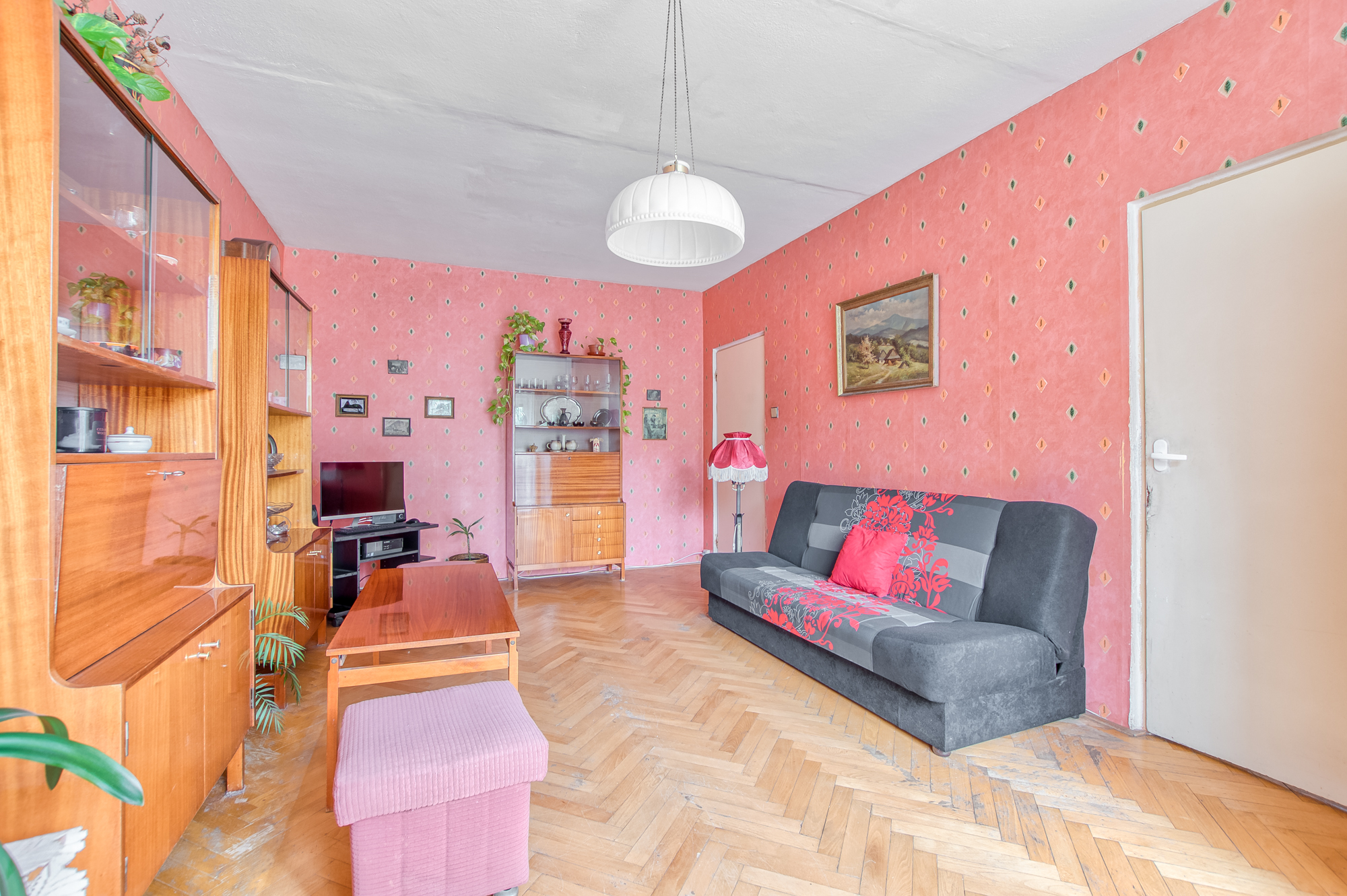 A teď pozor. Z jídelny se rovnou dostanete do obývacího pokoje, který má parádních 20 m². Pod nohama dřevěné parkety, které si po renovaci řeknou o druhý život. Je to ideální prostor pro velkou sedačku, knihovnu i televizi. A pořád vám zbyde dost místa na pohodlí.