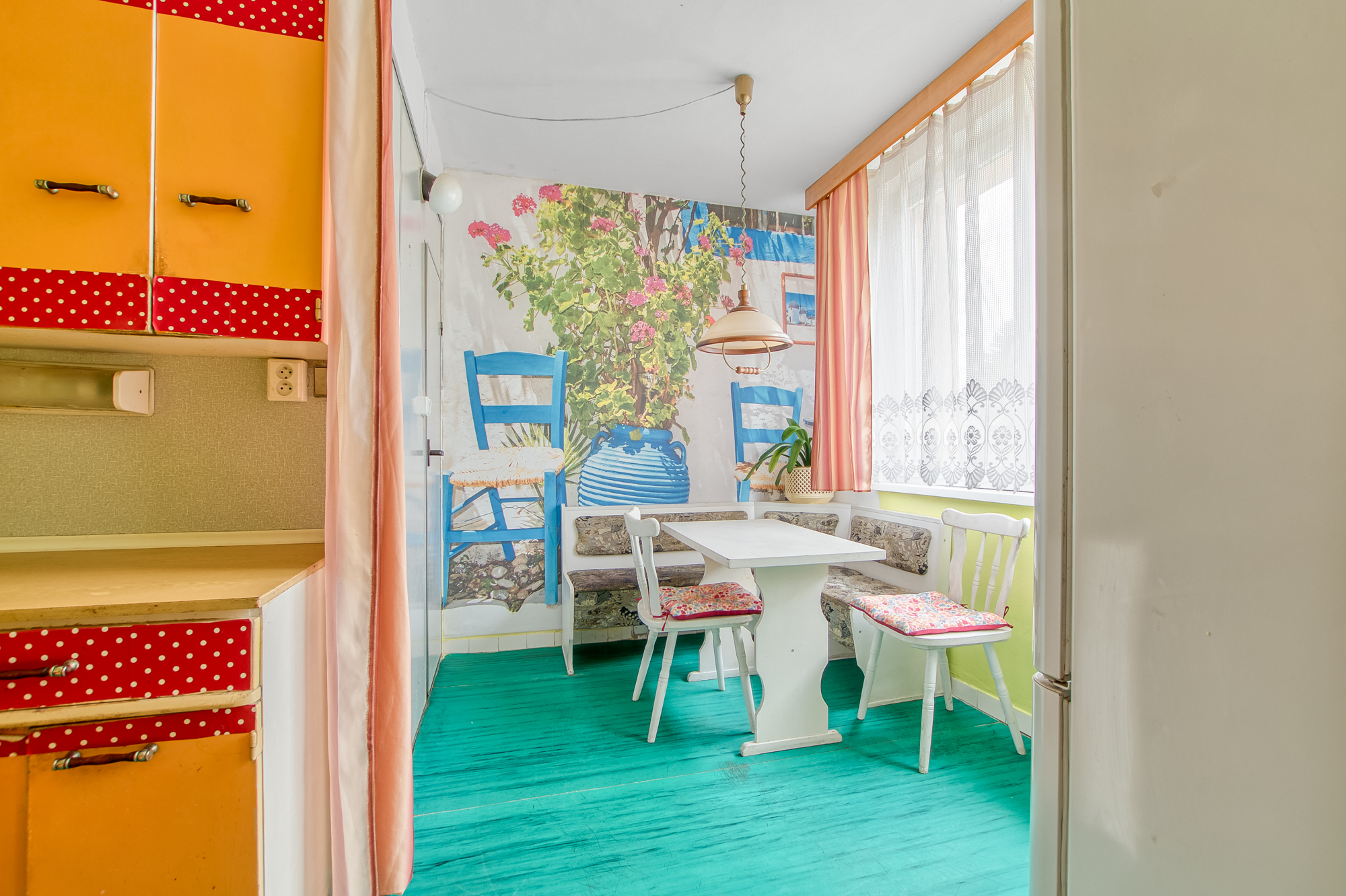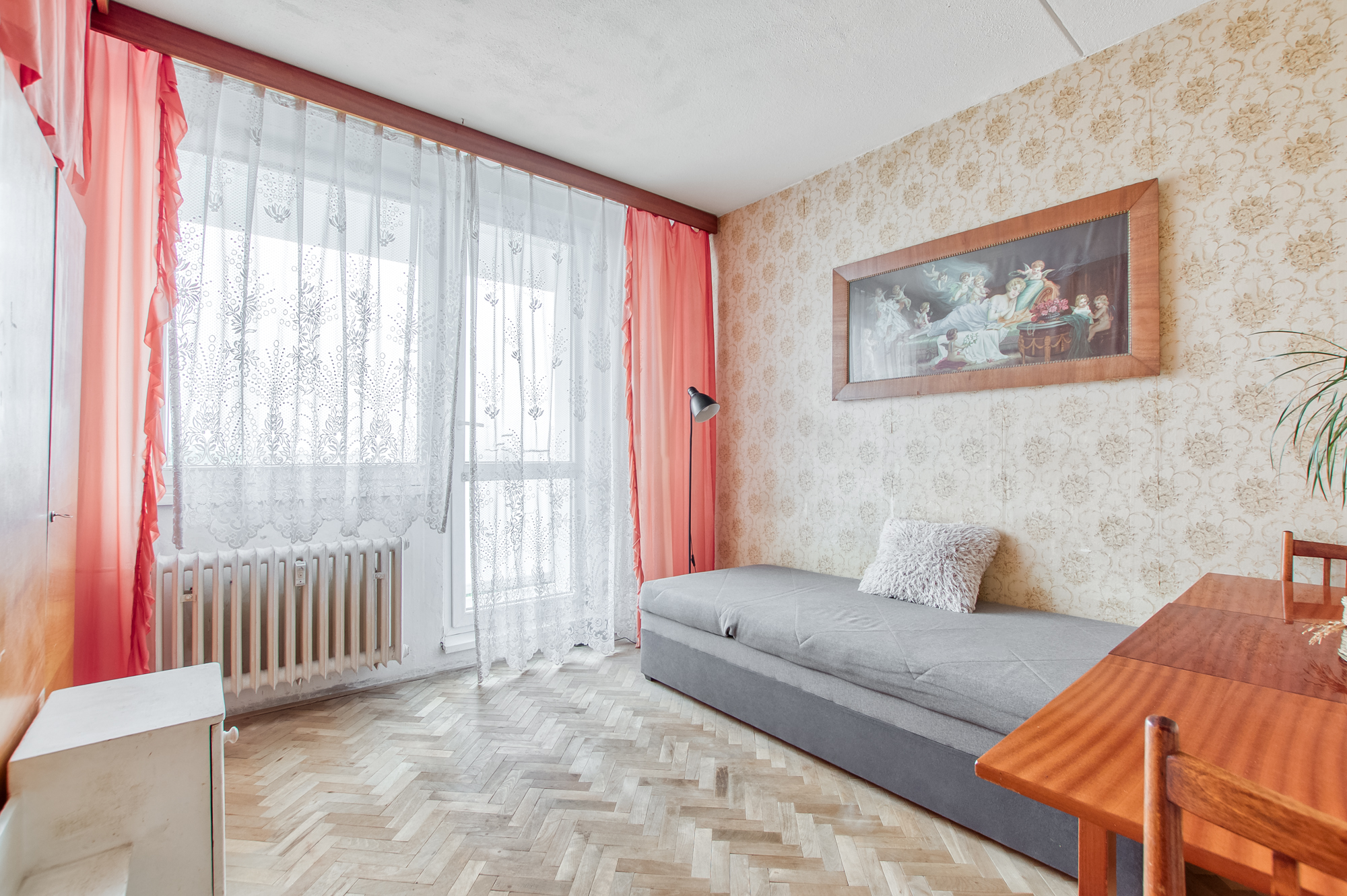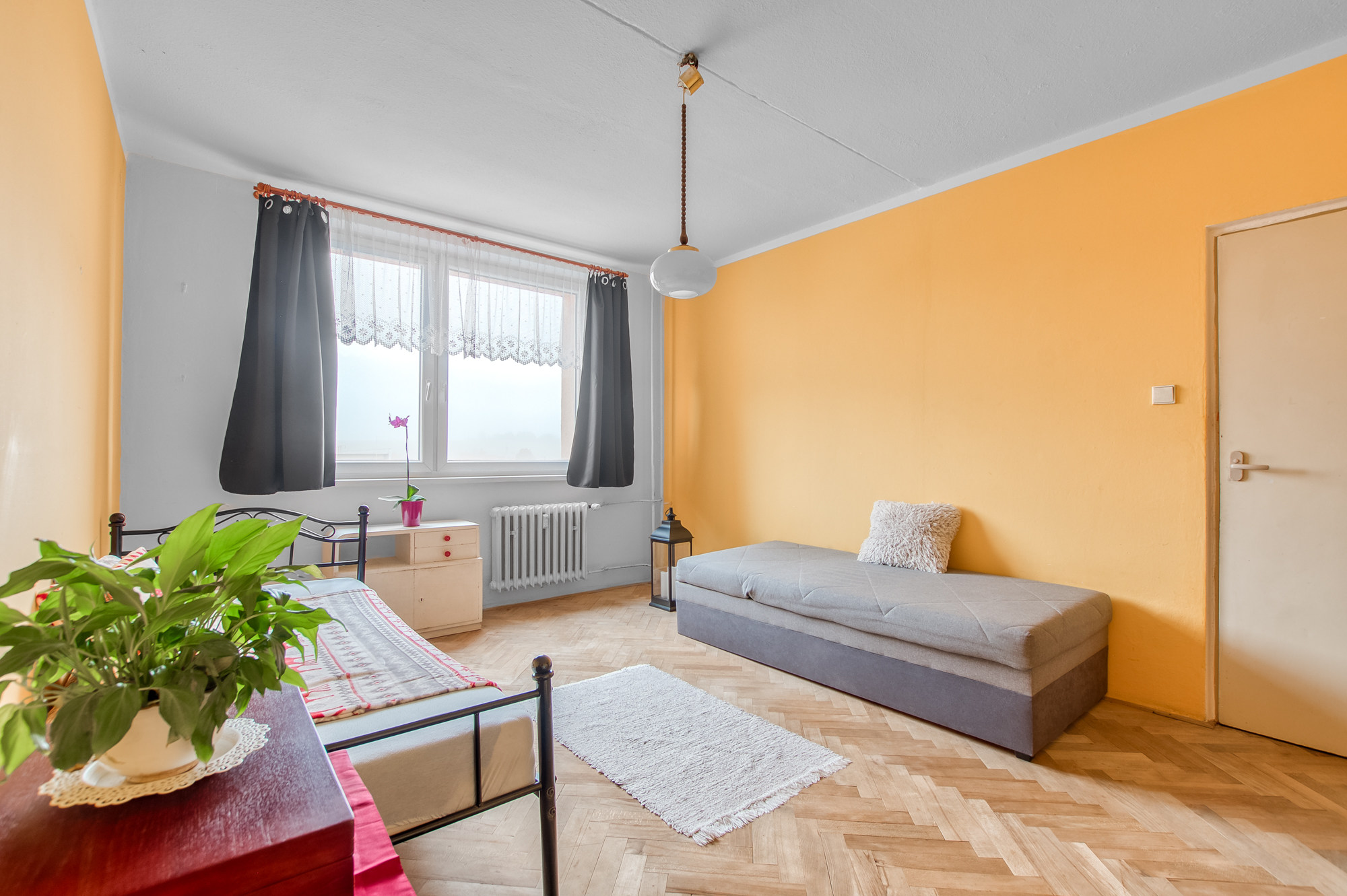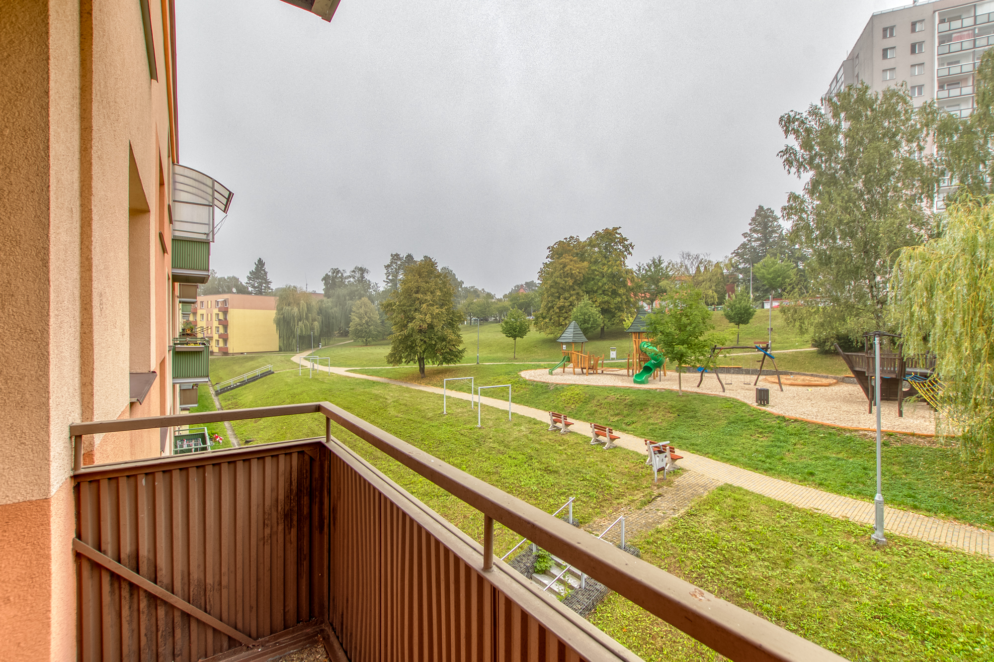 Nabízí se možnost propojit jídelnu s obývákem a vytvořit tak krásný, otevřený prostor. Pokud je zde opravdu příčka, která tomu nebrání, může vzniknout vzdušnější a modernější dispozice. Z obýváku se vychází na balkón, který směřuje do klidné části před domem. A hned pod okny je zrekonstruované dětské hřiště, kam máte výhled i přehled.