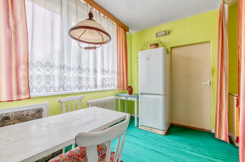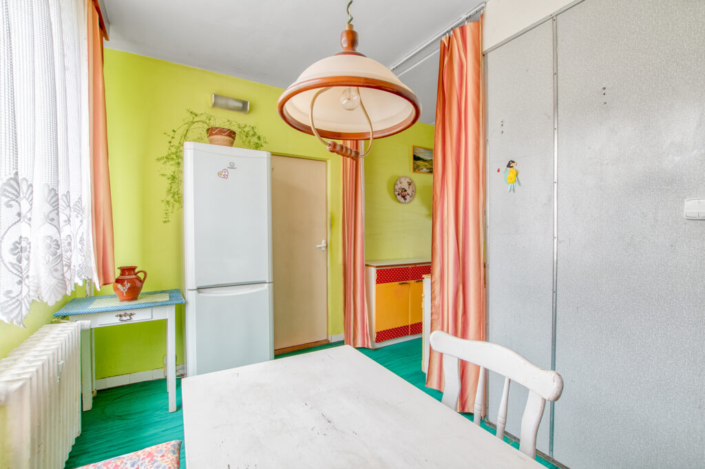 Z předsíně se pohodlně dostanete do kuchyně s jídelním koutem. Pokud přemýšlíte nad rekonstrukcí, tady se nabízí zajímavé řešení. Novou kuchyni můžete vytvořit přímo v jídelně a uvolněné místo po původní kuchyni využít pro rozšíření koupelny.