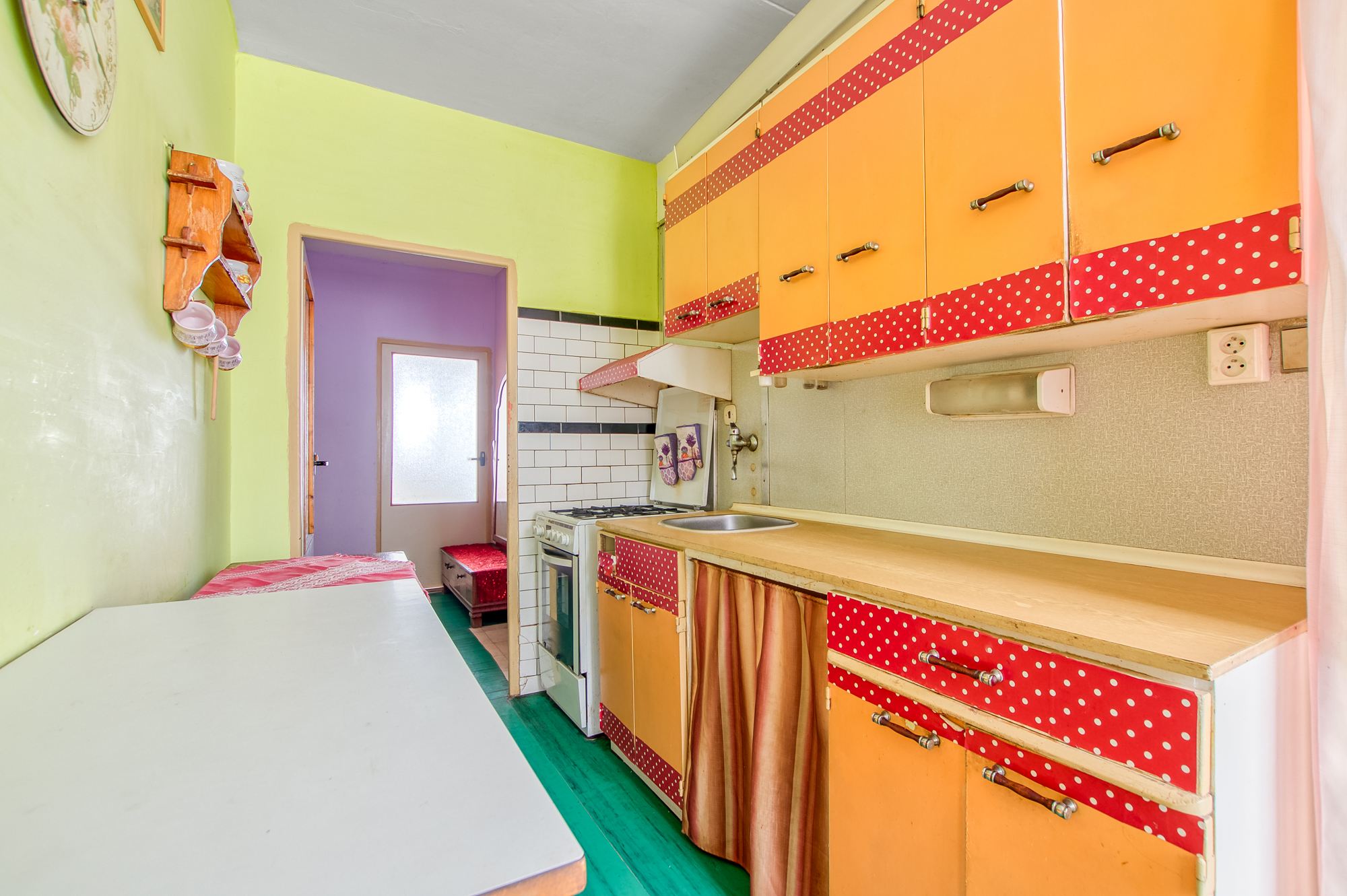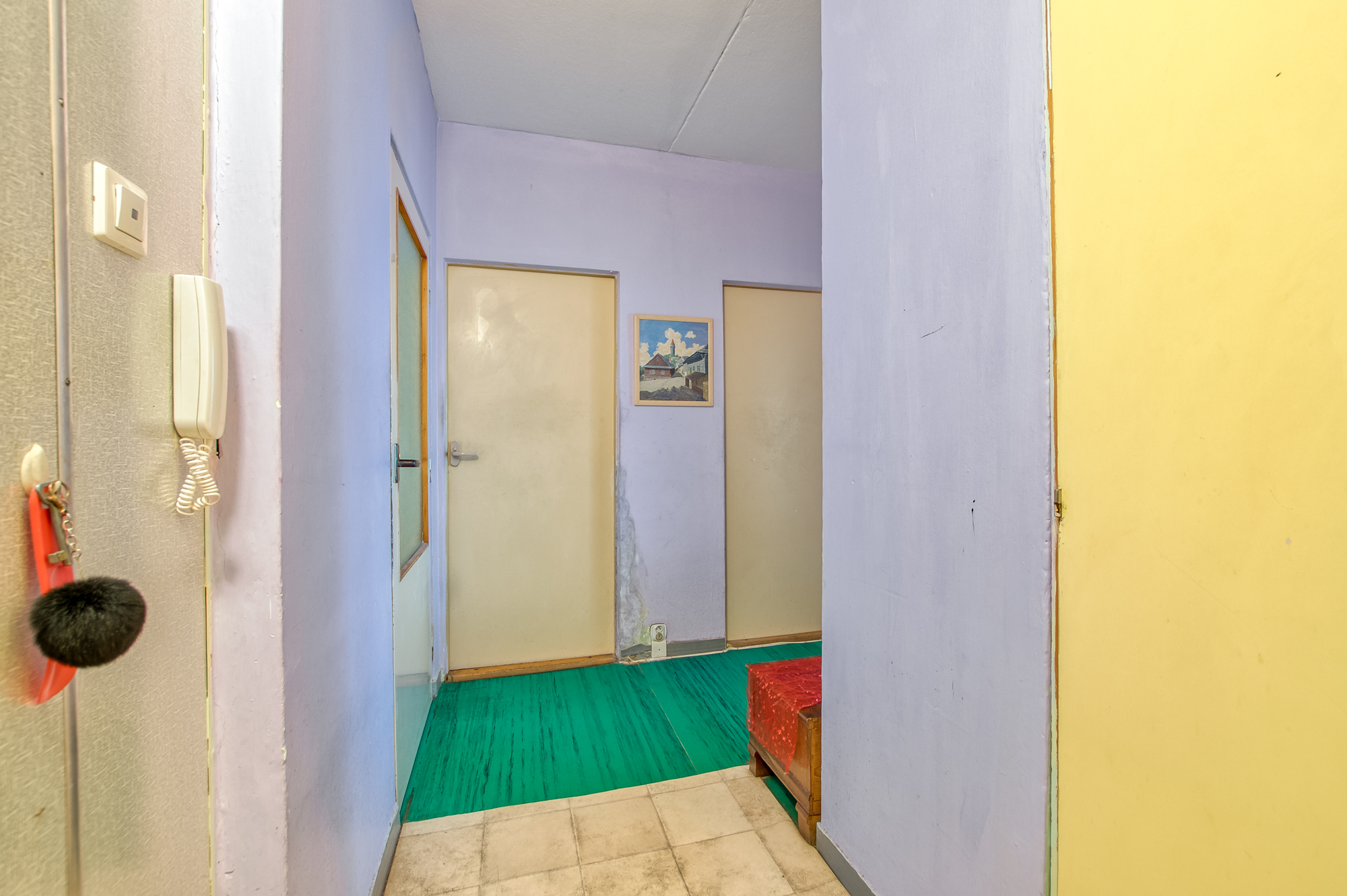 Po vstupu do bytu vás přivítá prostorná předsíň se šatnou o celkové výměře 7,5 m². Podlahu pokrývá praktické PVC. Odtud se dostanete do kuchyně s jídelním koutem o ploše 11 m², s plastovými okny orientovanými na jihovýchod. V případě rekonstrukce se přímo nabízí přesunout kuchyni do prostoru jídelny a zvětšit tak koupelnu. Stávající bytové jádro je umakartové, ale velmi dobře udržované. Koupelna má vanu, WC je samostatné.