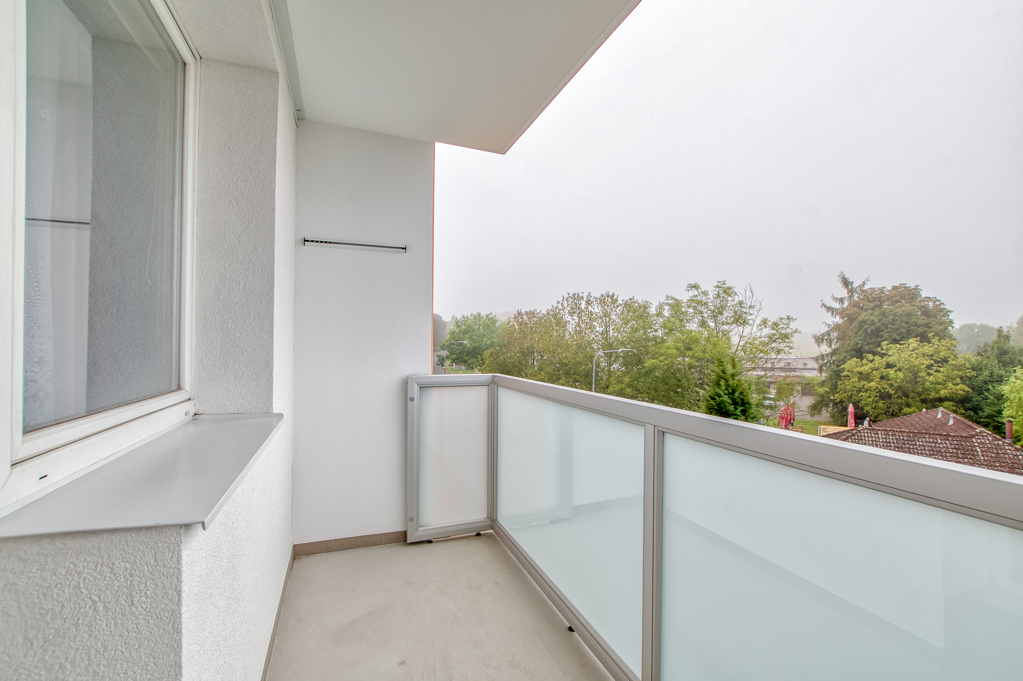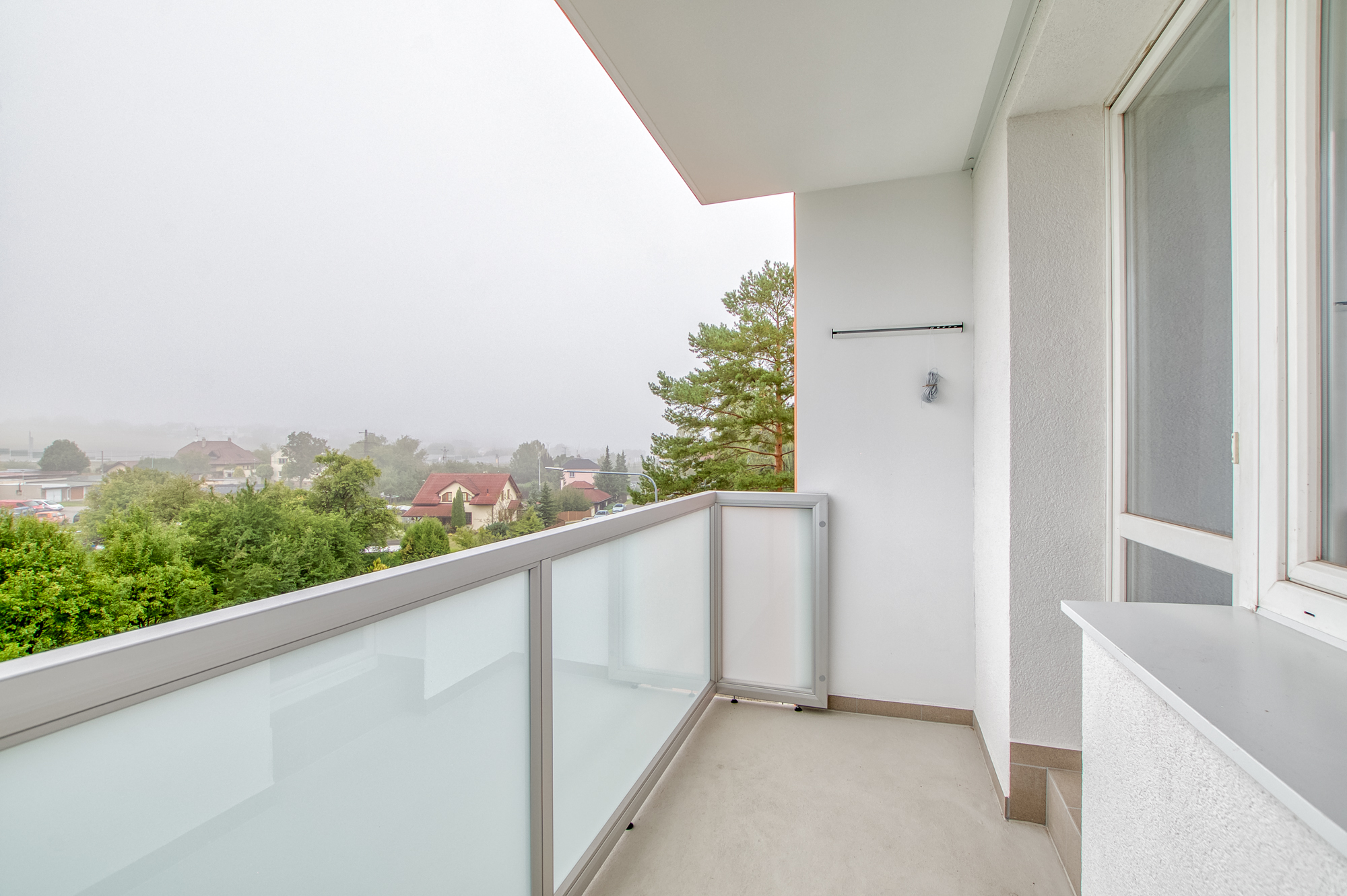 Tato lodžie vznikla v roce 2025 a je úplně nová, moderní a orientovaná na jihozápad. Když jsme byt fotili, byla ještě otevřená, ale teď už je zasklená. Díky tomu ji můžete využívat po celý rok. A navíc zasklení pomůže snížit i náklady na vytápění. Praktické i příjemné.