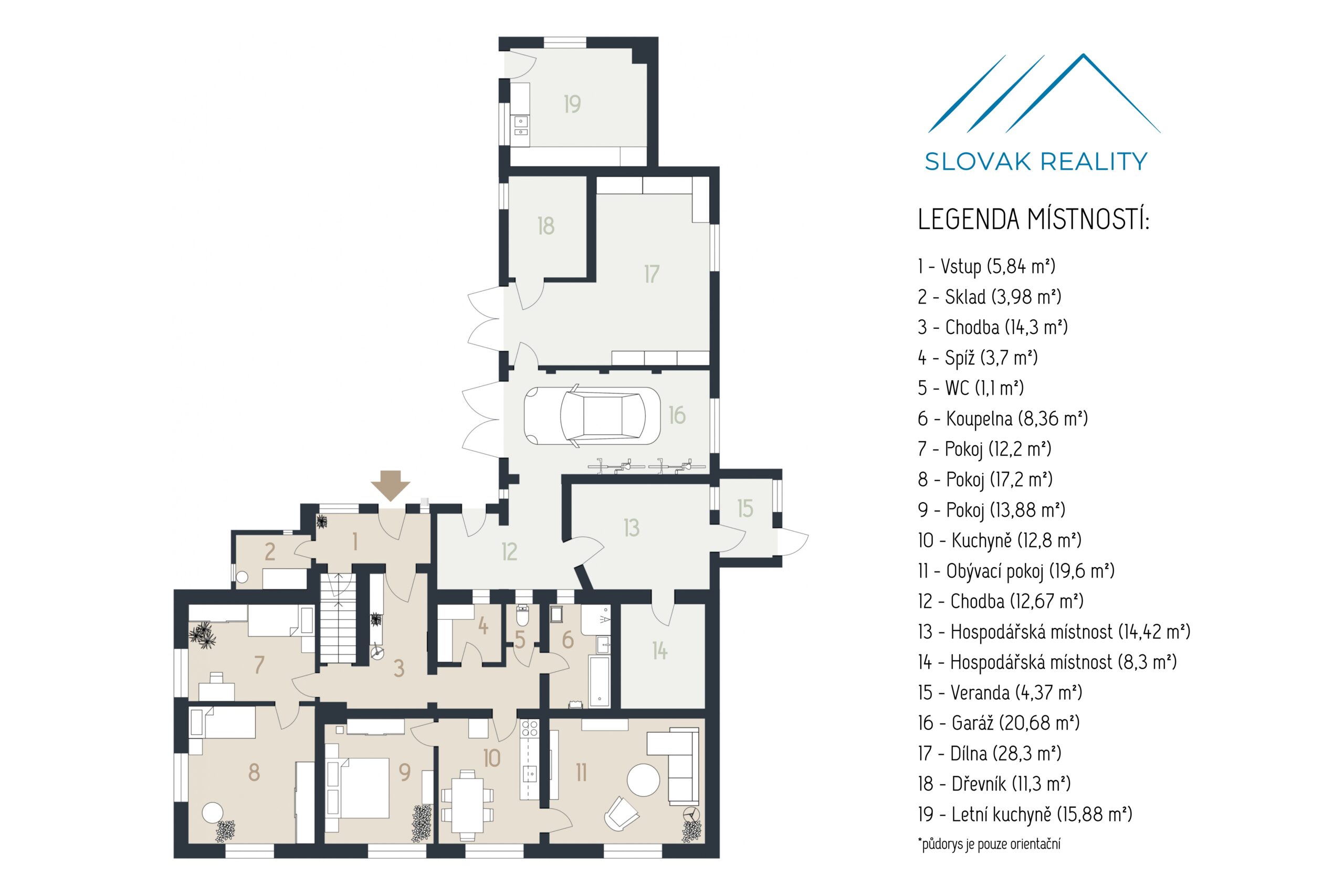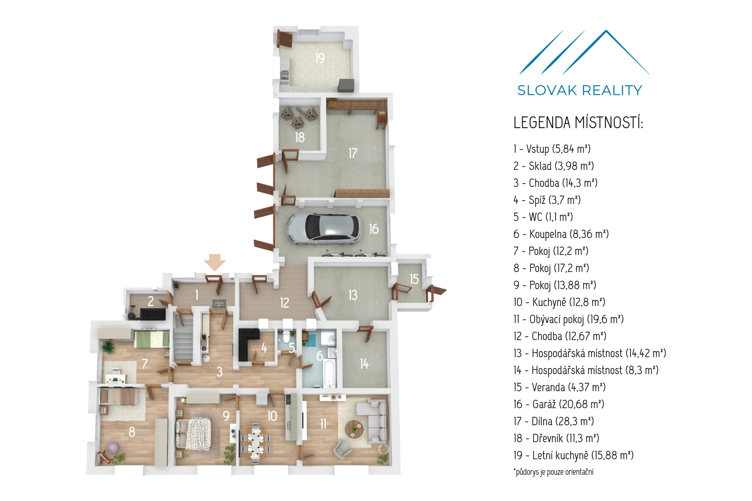 + 100 m² hospodářské prostory (dílna, garáž, dřevník…) + sklepy + pozemek 1541 m²