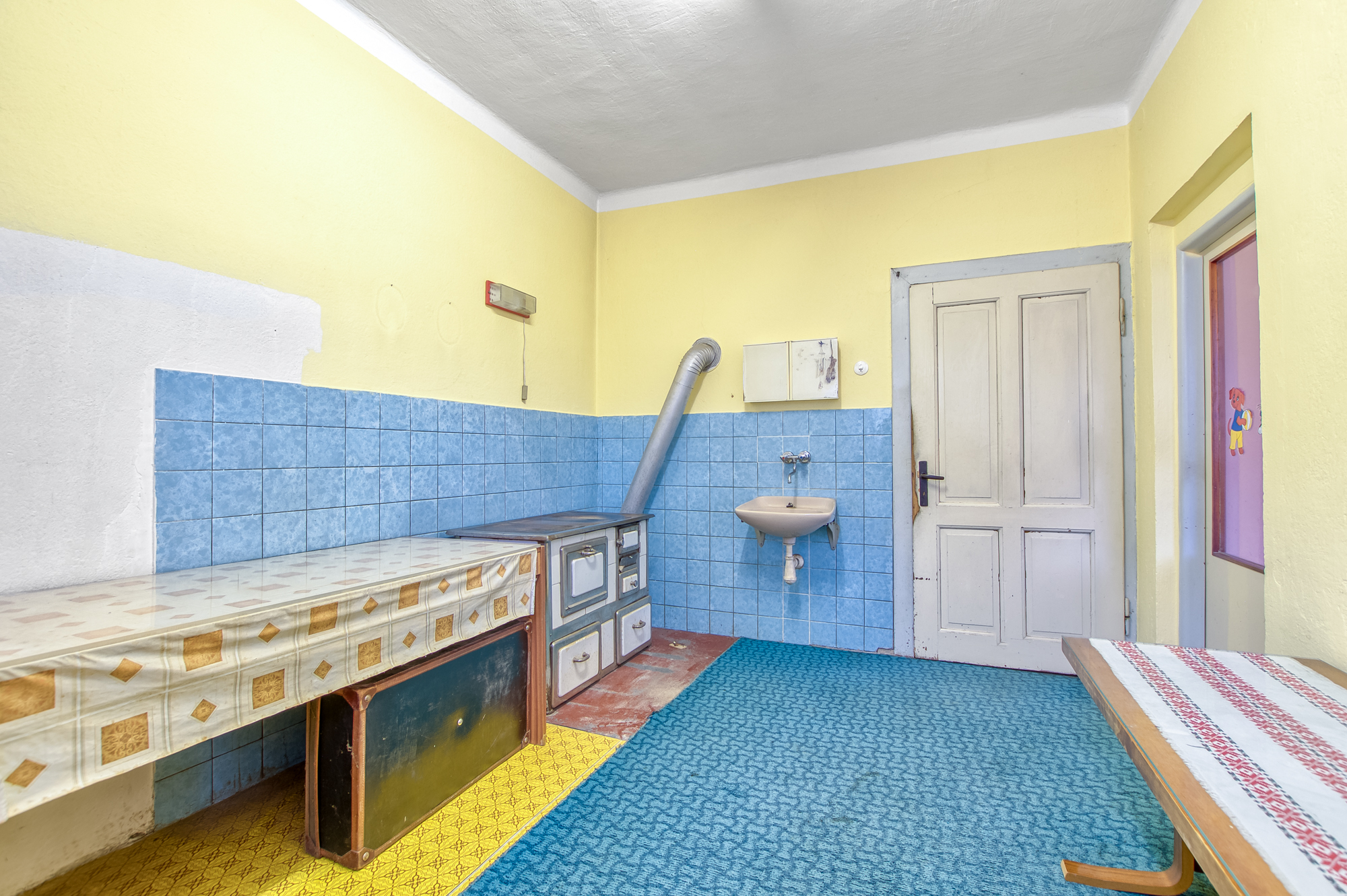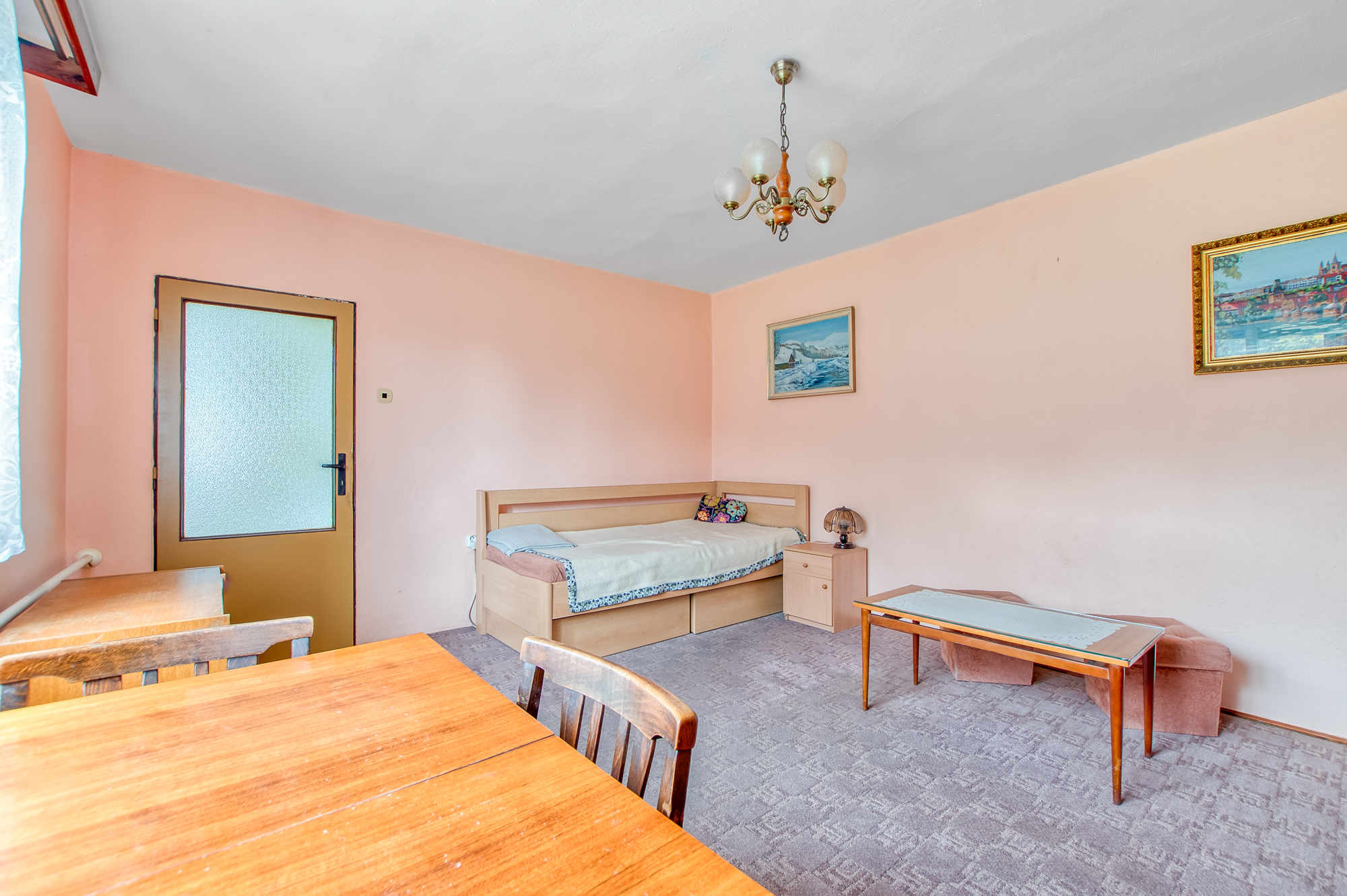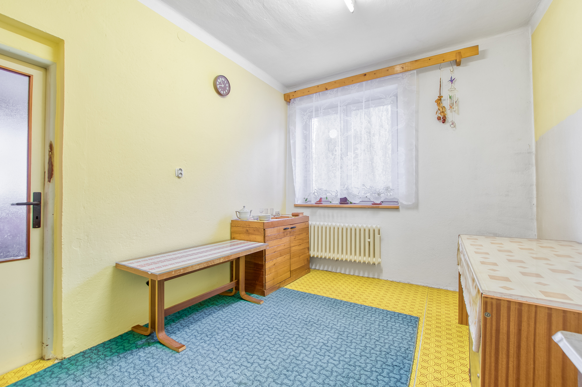 Jeden z těchto pokojů sloužil jako obývací pokoj. Má 19.6 m² a bez problémů ho využijete i jako ložnici nebo dětský pokoj podle potřeby. Elektřina v domě je stále původní, takže s rekonstrukcí určitě počítejte i v tomto směru.