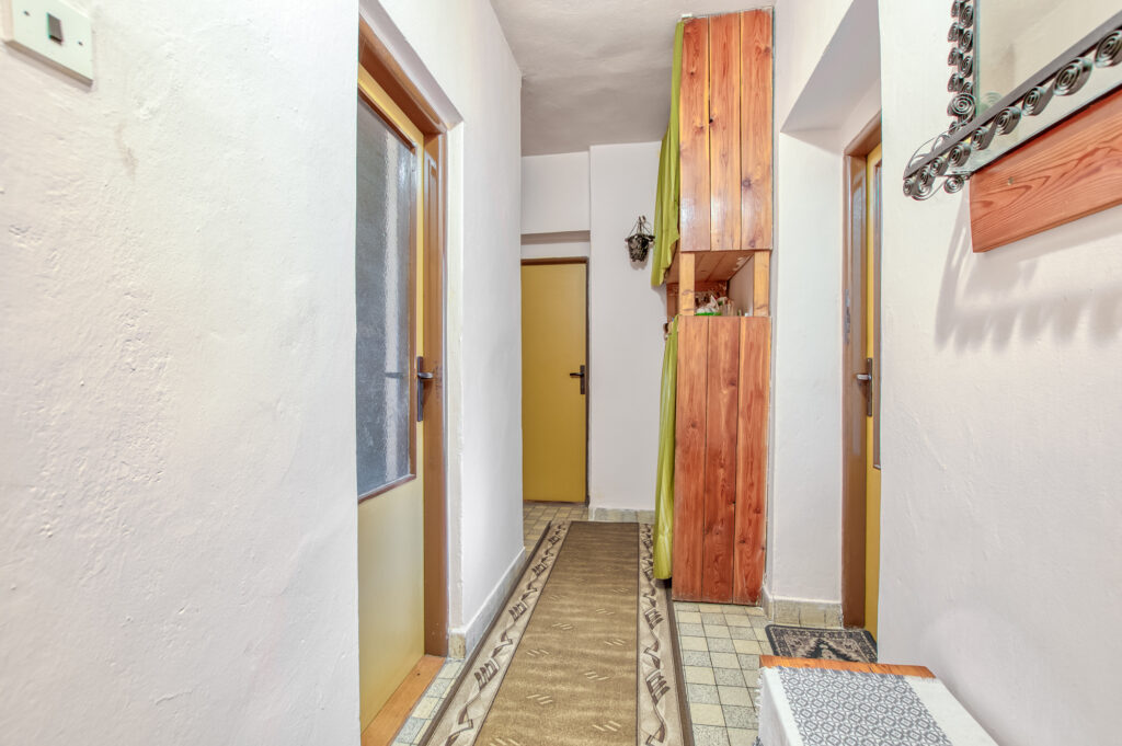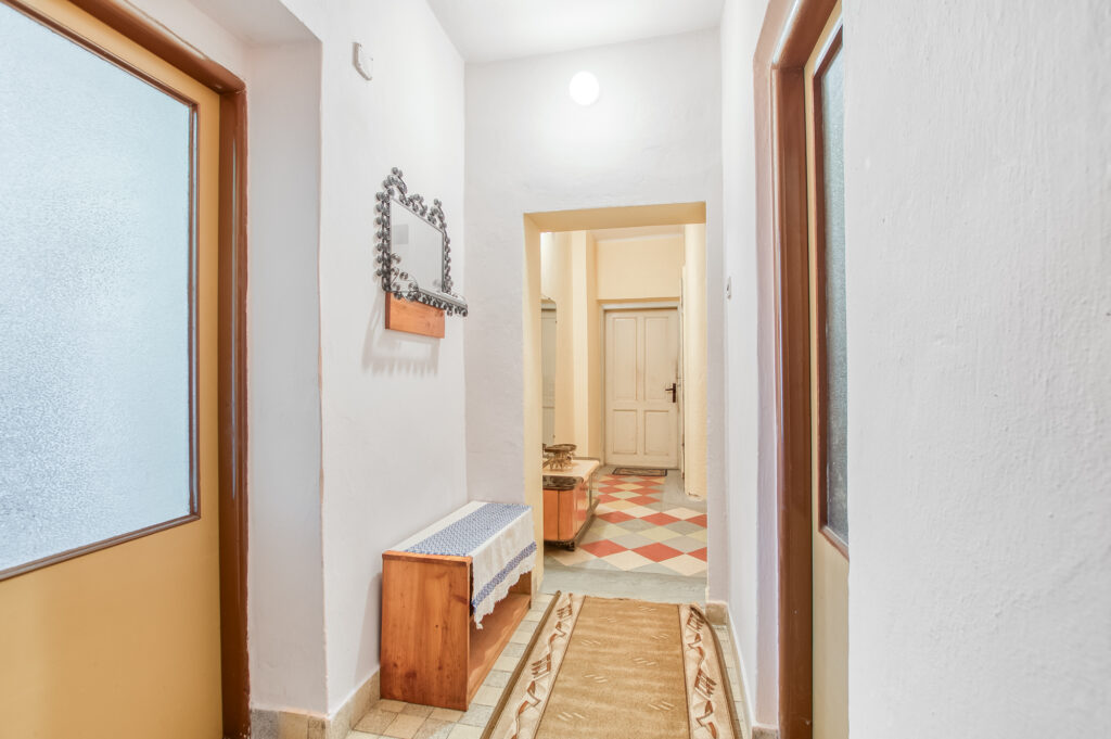 Vstupní chodba je opravdu velkorysá. Má přes 20 metrů čtverečních a pohodlně z ní projdete do všech hlavních místností. Podlaha je pokrytá dlažbou a prostor je prakticky řešený.