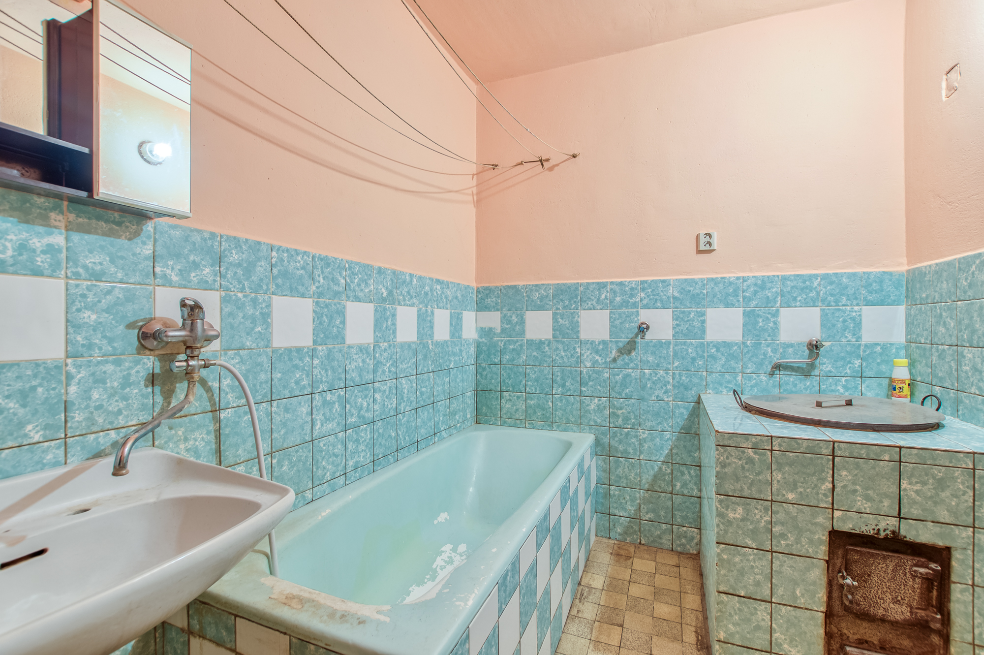 Koupelna je velikostně tak akorát, abyste si ji mohli upravit podle svých představ. Vejde se sem bez problémů třeba i sprchový kout společně s vanou. Toaleta je samostatná, což se vždy hodí. V rohu koupelny se dříve nacházel systém na ohřev vody pomocí topení dřevem. Dnes už spíš vzpomínka na staré časy, ale i to ukazuje, jak byl dům prakticky promyšlený.