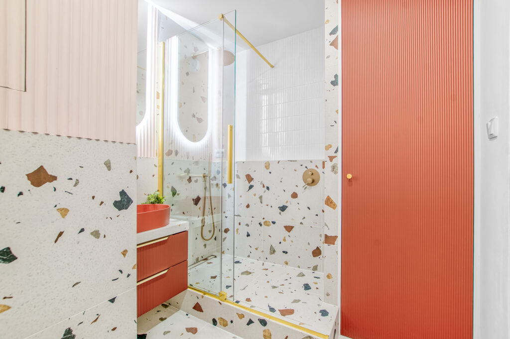 Za bezfalcovými dveřmi se skrytými zárubněmi se nachází koupelna s toaletou. Stěny jsou obloženy keramickým obkladem v dekoru Terrazzo s kamenickými rohy, ve sprchovém koutě je bílý malometrážní obklad. Za zrcadlem s integrovaným LED osvětlením je dekorativní obkladový panel v malovatelném provedení, v tomto případě v jemném lososovém odstínu. Osazeny jsou podomítkové baterie v matně zlatém chromu. Samozřejmostí je vyhrazený prostor pro pračku a sušičku za kvalitními dvířkami.