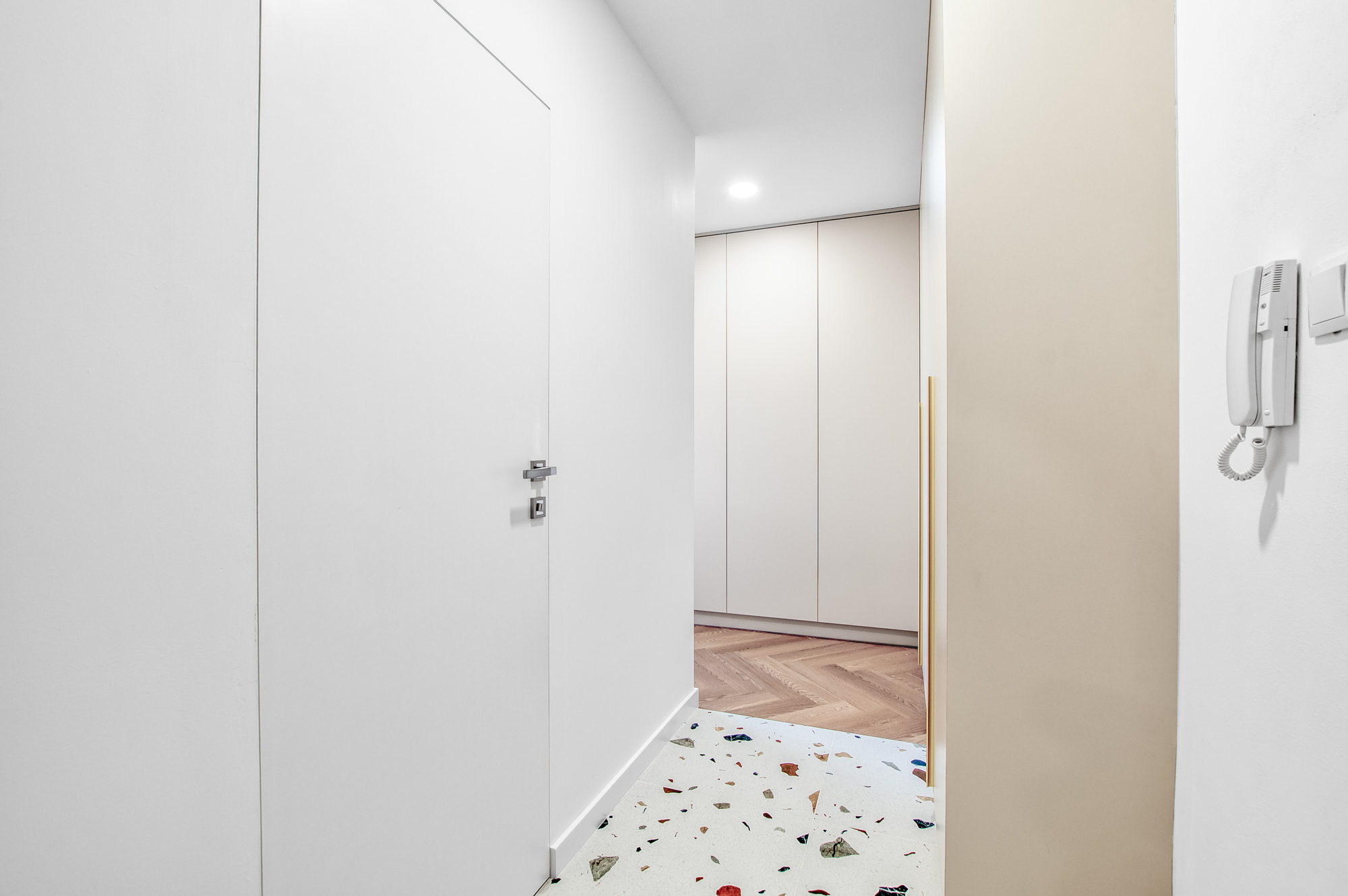 Z předsíně se vstupuje do hlavní obytné části, která je propojena s kuchyní a působí vzdušně a svěže. Na podlaze je kvalitní vinyl, pod kterým se původní dřevěné parkety zalily a vyrovnaly nivelací, aby vznikl dokonale rovný povrch. V celém bytě jsou nové omítky, kompletně nová elektroinstalace a snížené sádrokartonové stropy.