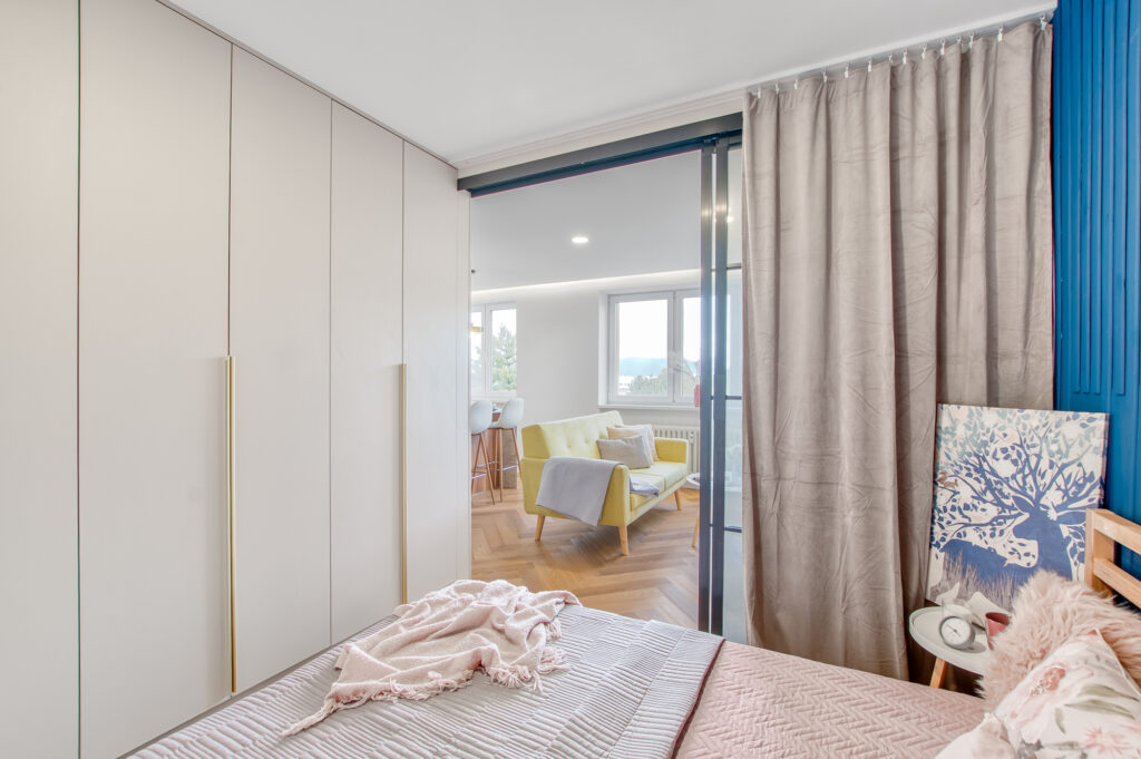 Do ložnice se vstupuje přes průhledné posuvné dveře, které plynule oddělují a odhlučňují prostor od obývací části. Ložnice vznikla chytře využitím vestavěných úložných skříní v odstínu mandle. Šatní sestava je promyšlená do posledního detailu a nabízí dostatek místa pro veškeré oblečení i doplňky. Zajímavým designovým prvkem jsou dřevěné latě na stěně, vymalované v tmavě modrém tónu, který prostoru dodává klid, hloubku a pocit relaxace.