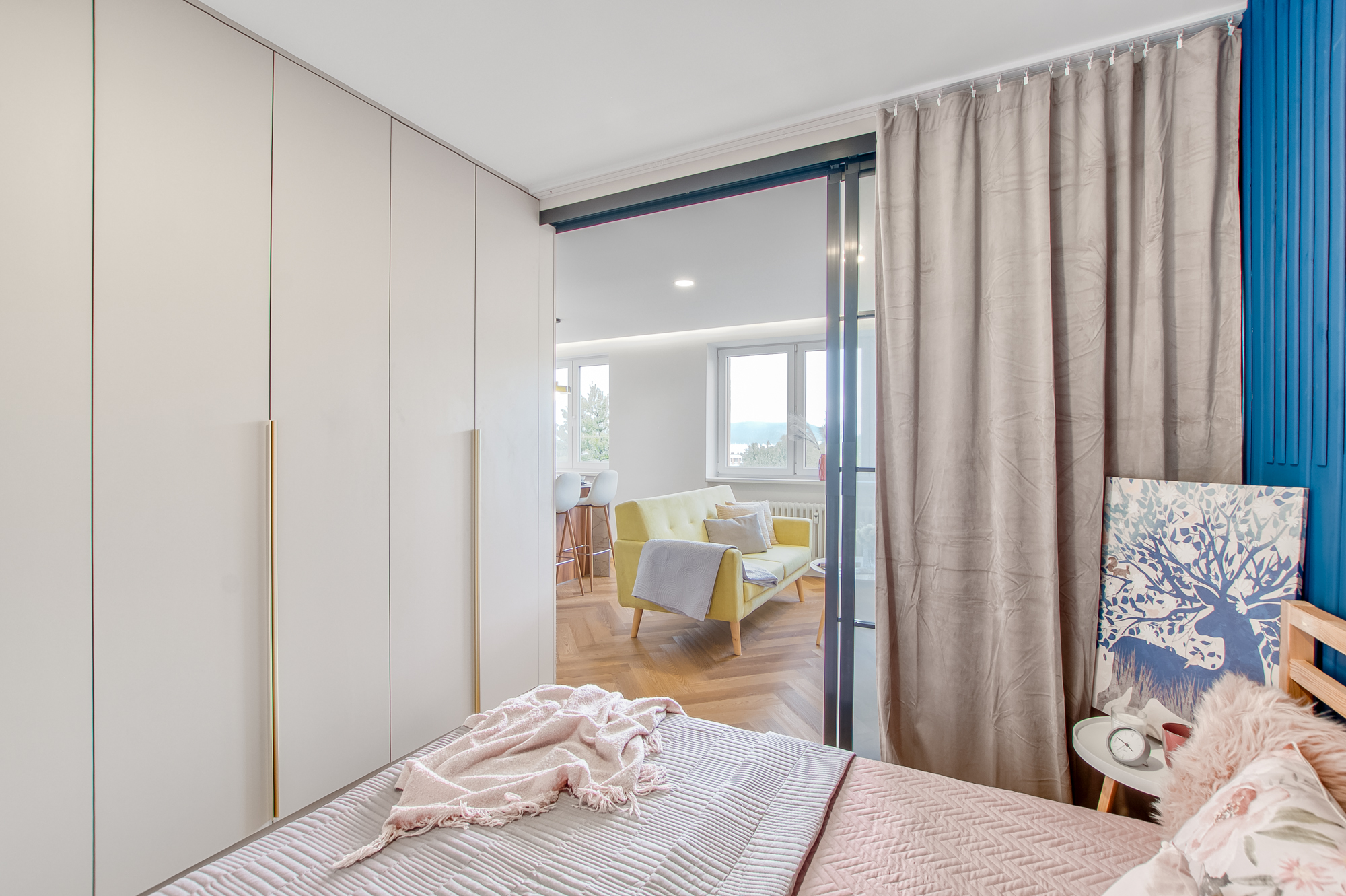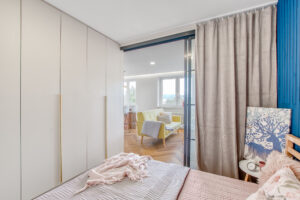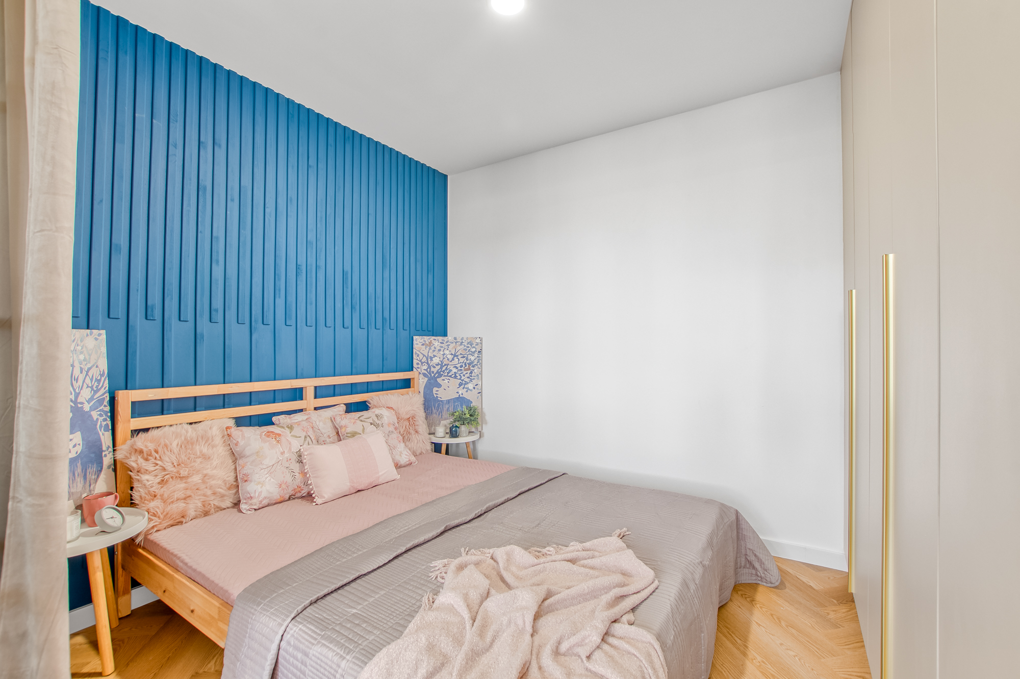 Ložnice je oddělena průhlednými posuvnými dveřmi. Vestavěné skříně vyrobené truhlářem v odstínu mandle nabízejí dostatek prostoru a dekor dřevěných latí v tmavě modrém nátěru dodává místnosti klidnou atmosféru. Nábytek viditelný na fotografiích je homestaging a není součástí pronájmu vestavěné prvky zůstávají.