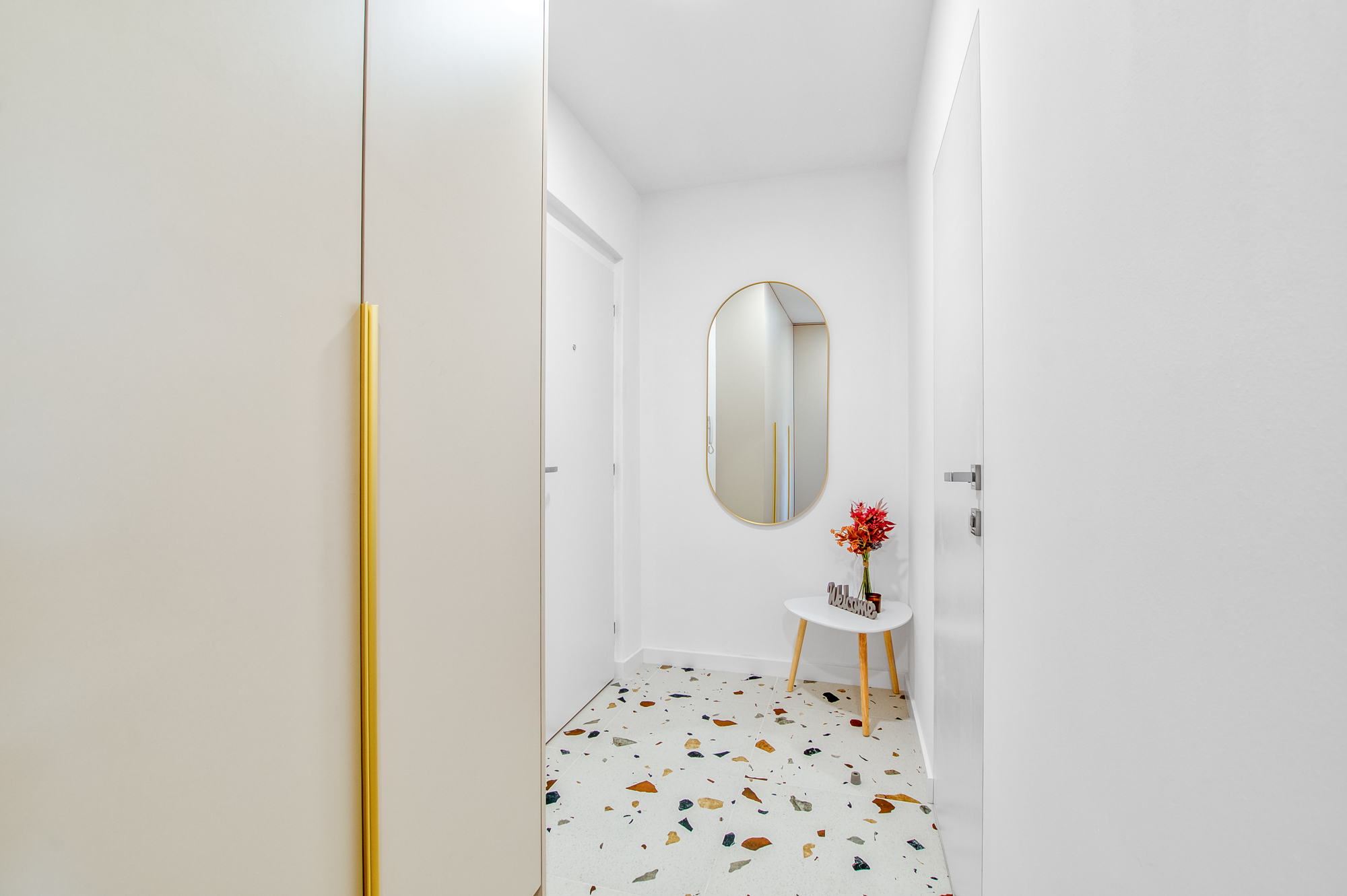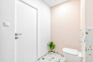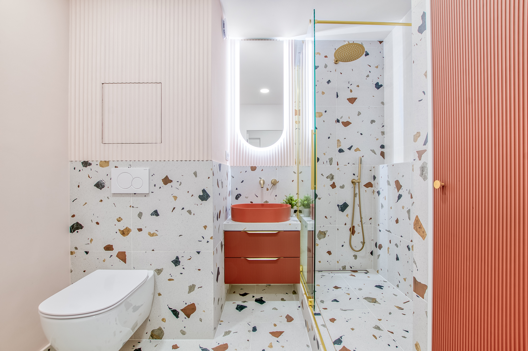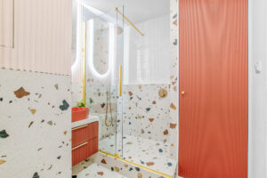 Koupelna je řešena moderně a prakticky. Je přístupná bezfalcovými dveřmi se skrytými zárubněmi a je zde sprchový kout s bílým malometrážním obkladem. Stěny jsou obloženy keramickým obkladem v dekoru Terrazzo s kamenickými rohy. Za zrcadlem s integrovaným LED osvětlením je dekorativní panel v jemném lososovém odstínu. Osazeny jsou podomítkové baterie v matně zlatém chromu a nechybí prostor pro pračku a sušičku skrytý za kvalitními dvířky.
