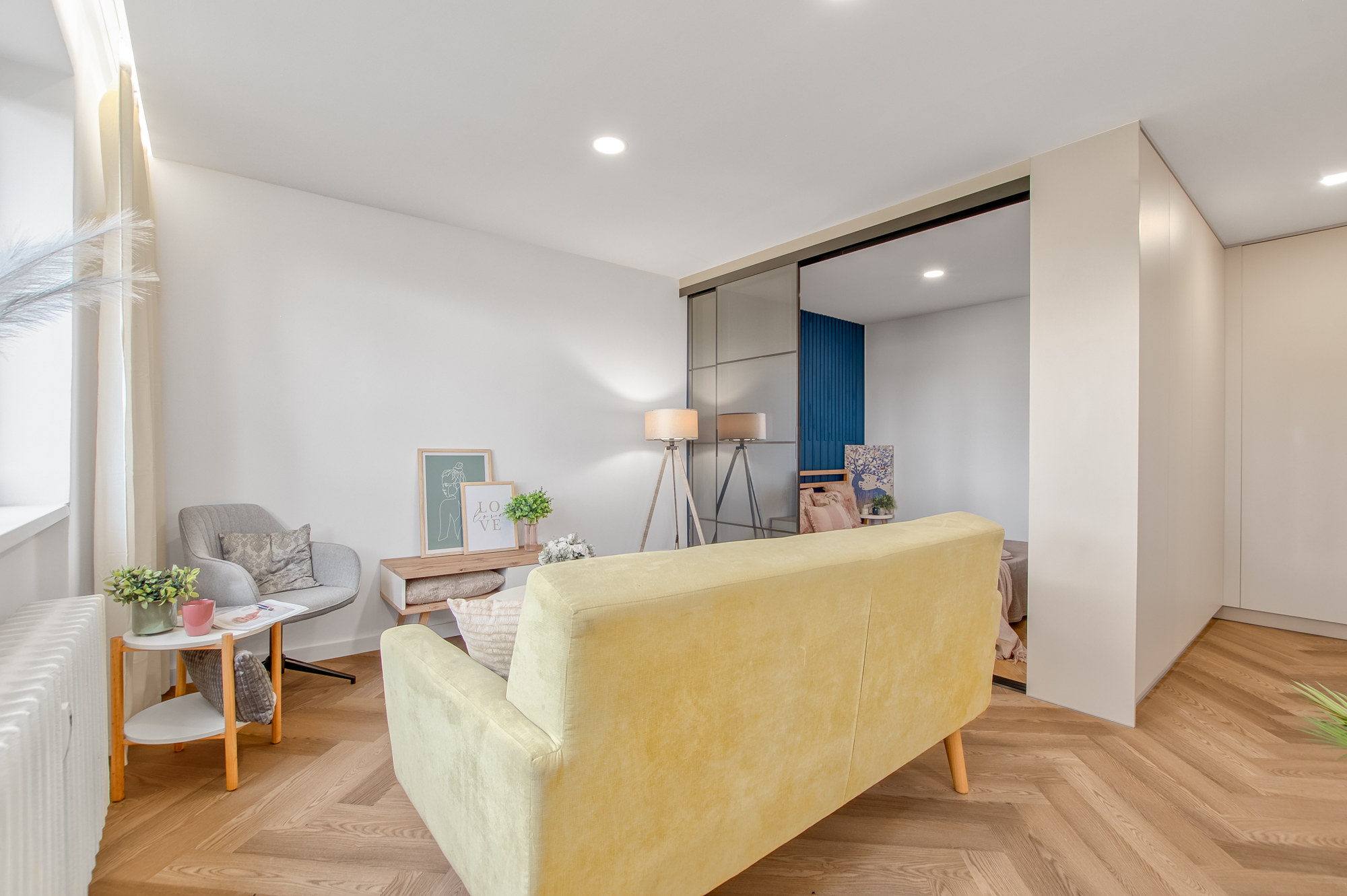 V předsíni jsou vestavěné skříně na míru které nabízejí dostatek úložného prostoru a zároveň vytvářejí samostatnou ložnici oddělenou průhlednými posuvnými dveřmi. Obytná část má přípravu pro televizi a dostatek zásuvek. Snížený strop ukrývá kolejničku na záclony a atmosféru doplňuje nepřímé LED osvětlení u závěsů. Podlahy jsou nové v obytné části je vinyl v předsíni a koupelně dlažba.