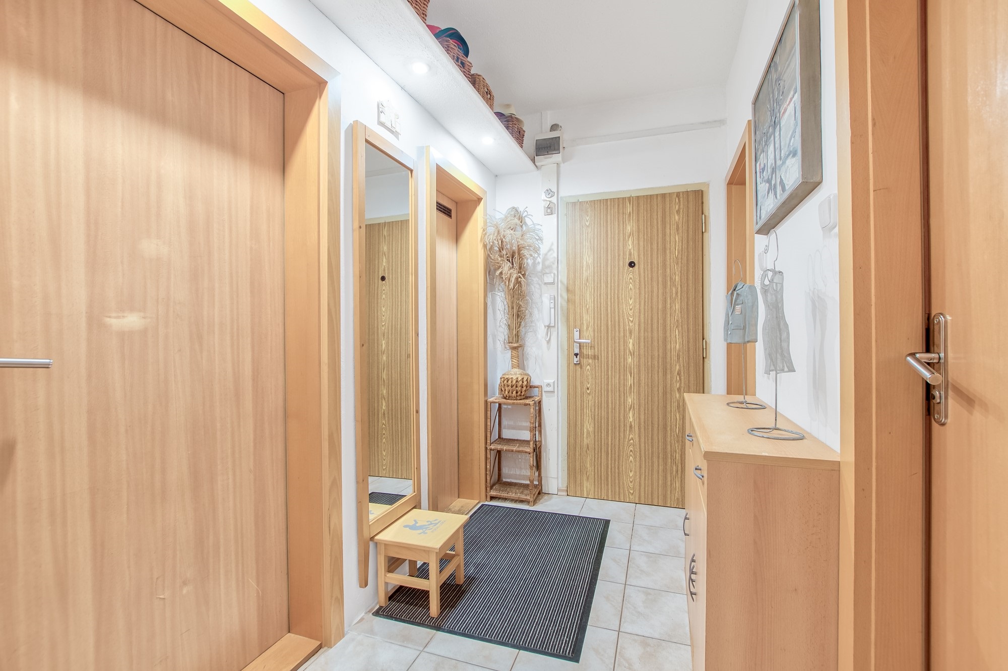 Po vstupu do bytu se ocitnete v chodbě, která je prakticky řešená a přehledná. Podlahu zde tvoří dlažba, která je odolná a snadná na údržbu. Prostor nabízí dostatek místa pro úložné skříně a každodenní zázemí domácnosti.