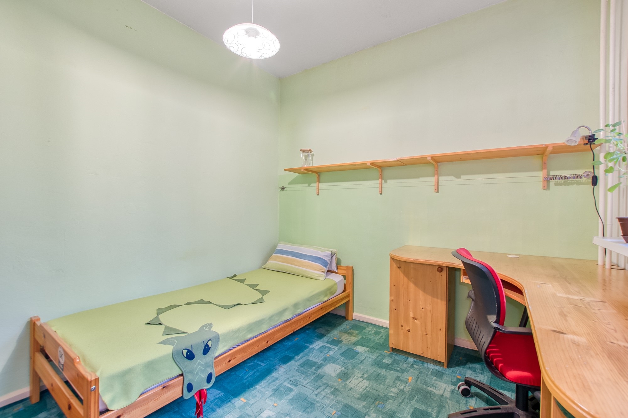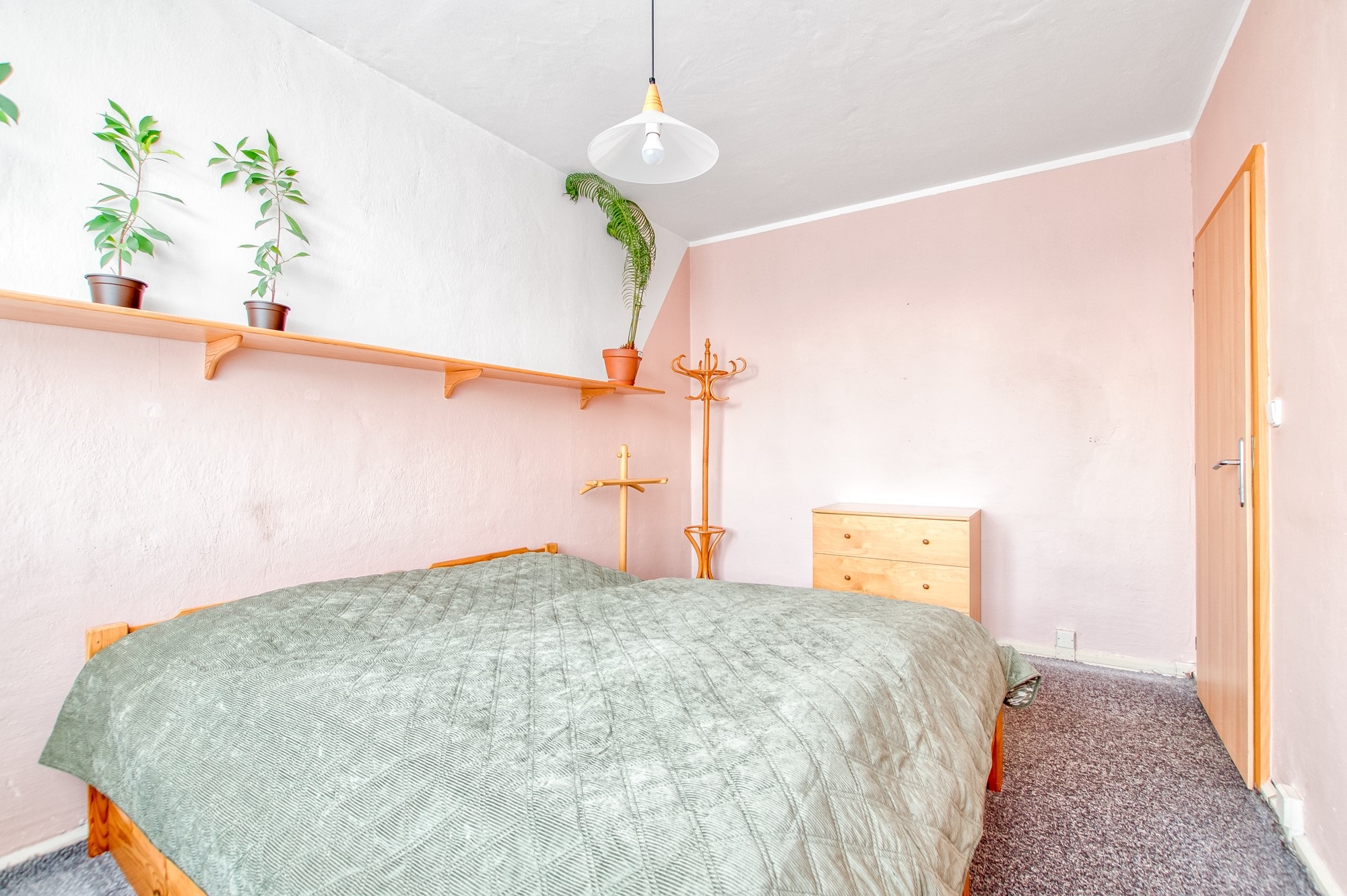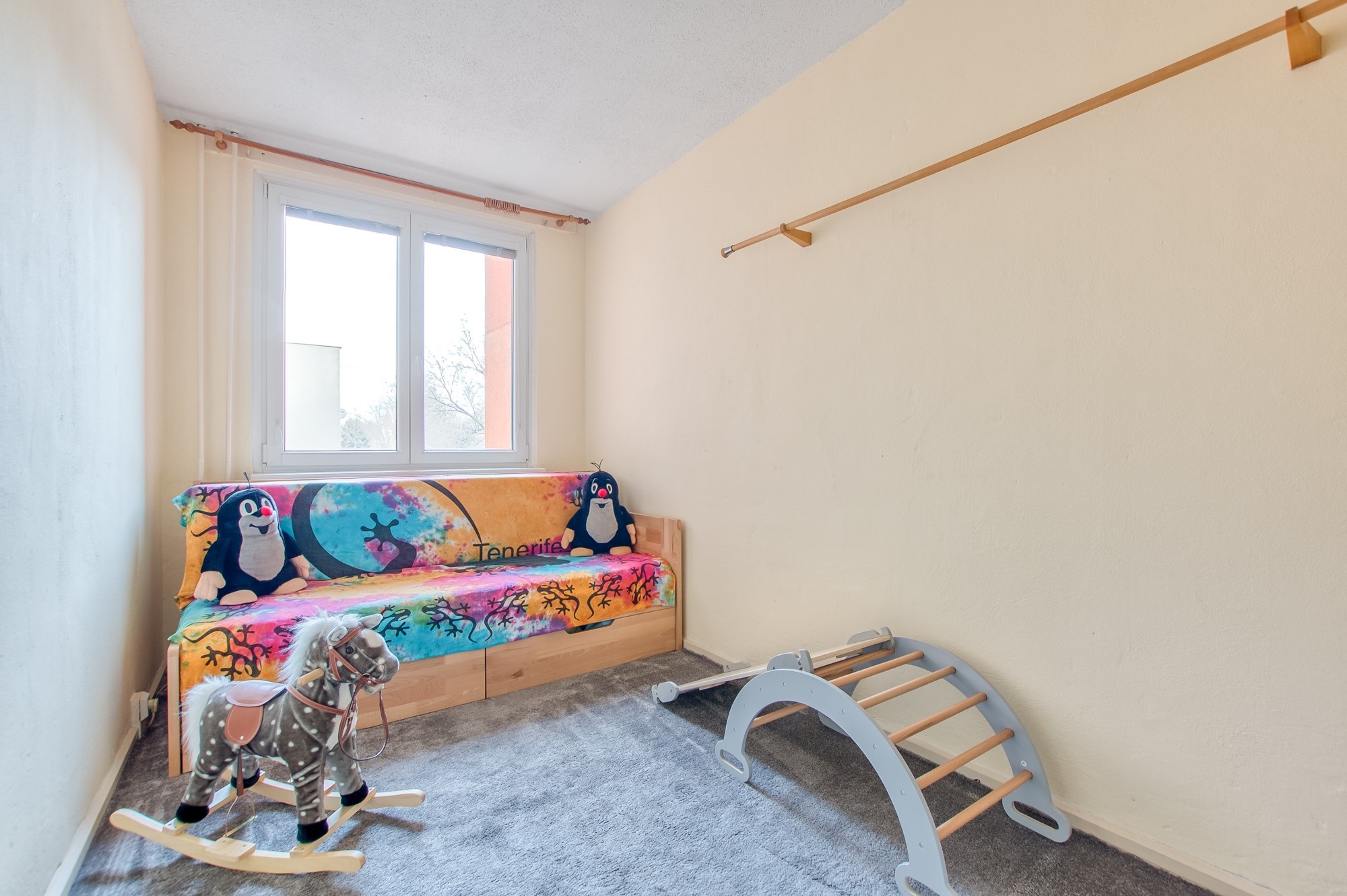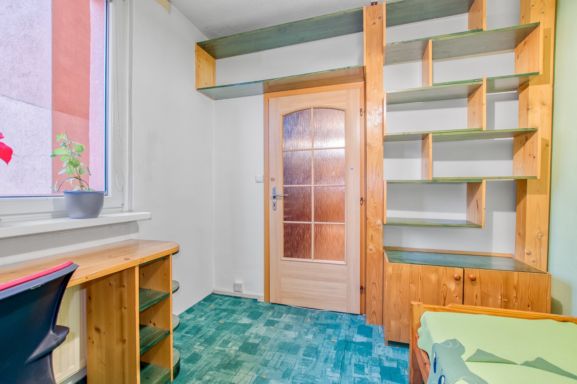 Z chodby se vstupuje do menšího pokoje o výměře 9,61 m², který se nachází hned vedle prostorné komory. Díky tomu nabízí praktické využití jako dětský pokoj, pracovna nebo klidný pokoj pro hosty. V rámci rekonstrukce byly v této místnosti provedeny nové omítky, stejně jako ve zbytku bytu.
