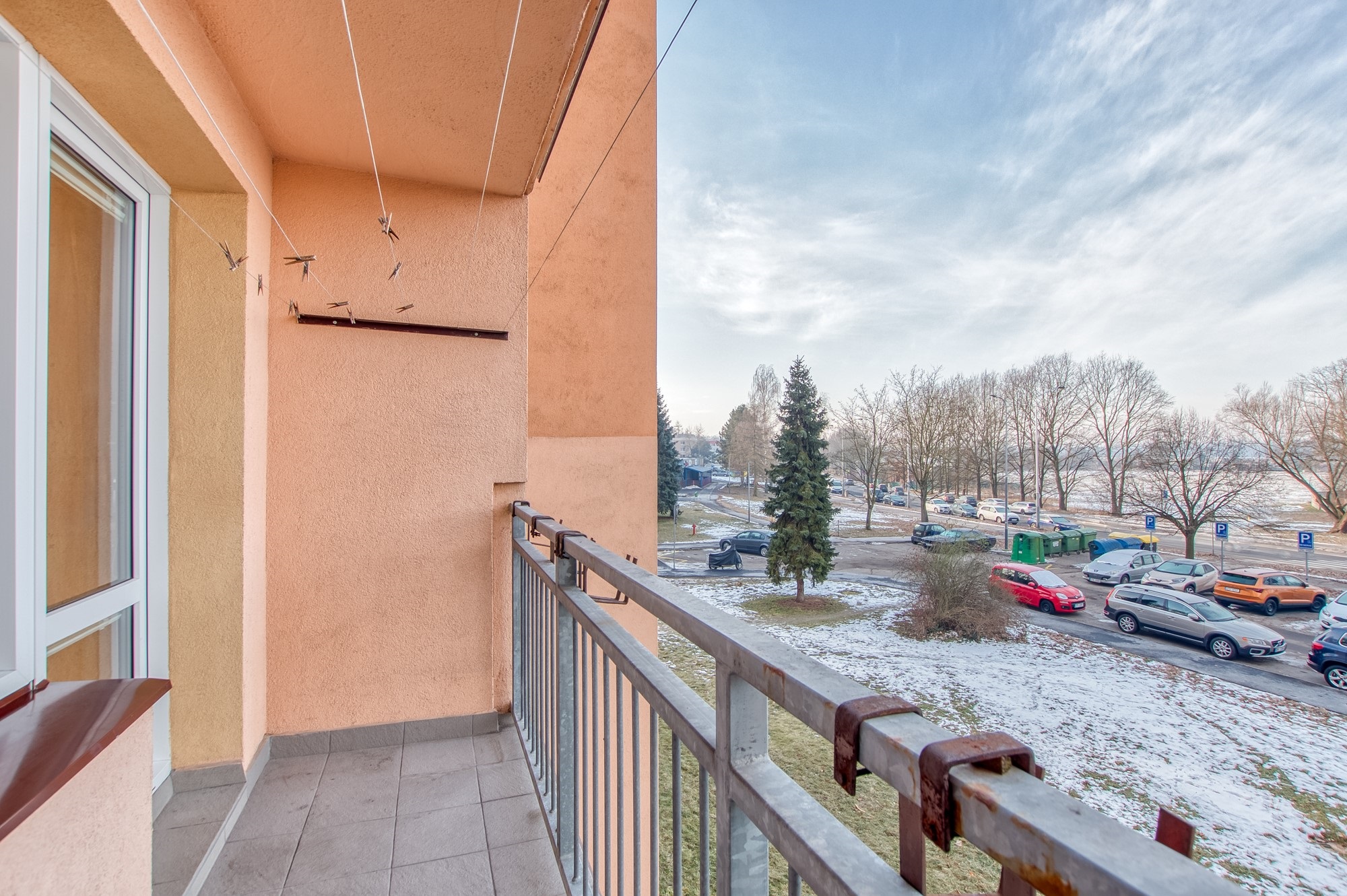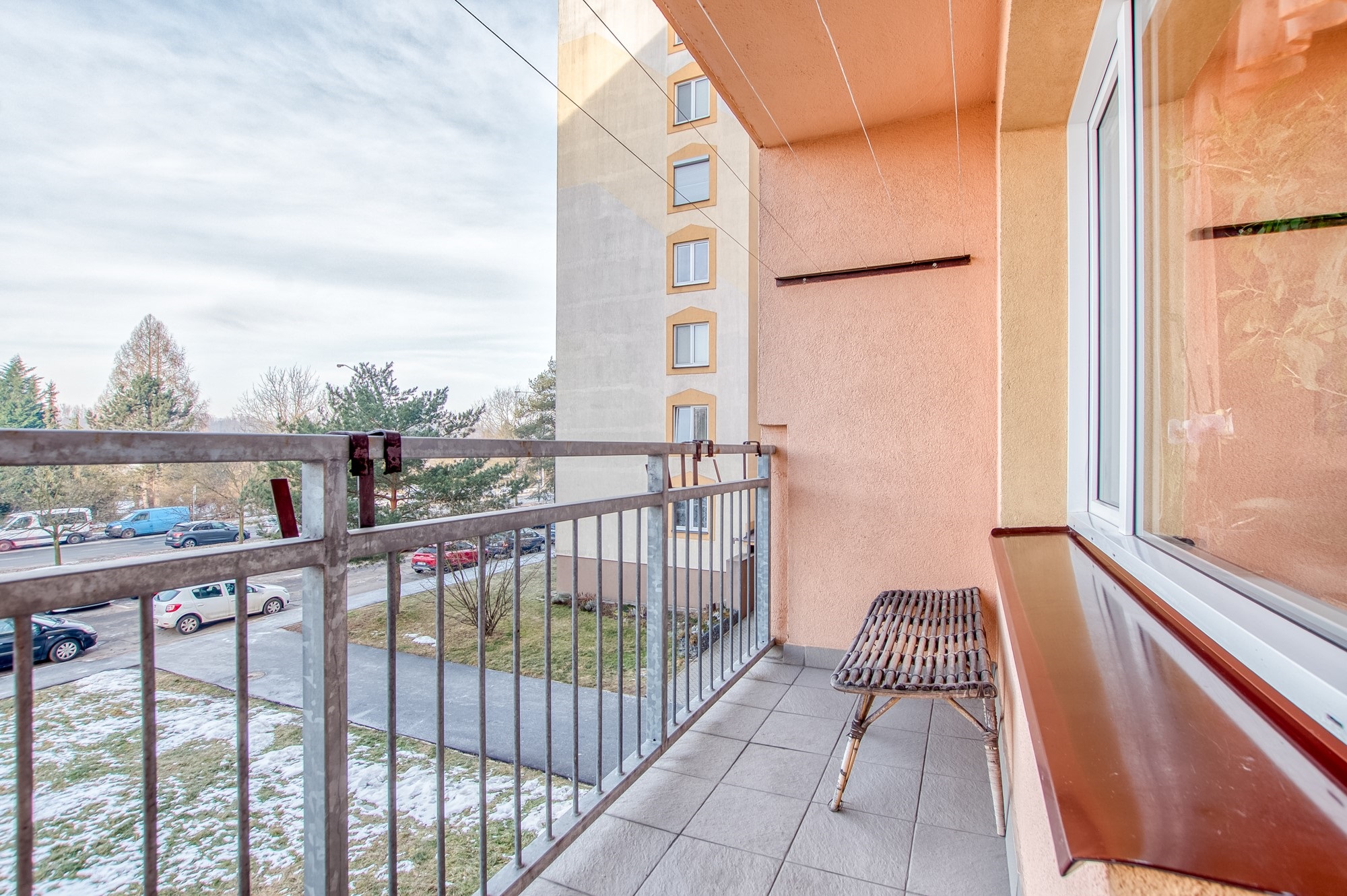 Lodžie má výměru 5 m² a je orientovaná na jihozápad. I z druhého patra se otevírají pěkné výhledy do okolní krajiny a díky orientaci si zde užijete odpolední světlo i večerní atmosféru. Parkování je možné přímo na ulici u domu a funguje bez větších problémů i ve večerních hodinách.